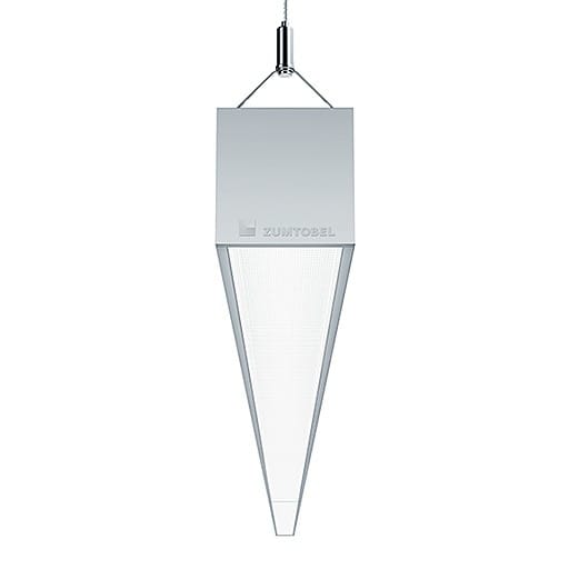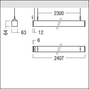Luminaire suspendu à LED étroit, à composante directe/indirecte, Puissance du luminaire: 80 W LED, ballast électronique avec convertisseur à LED. Durée de vie des LED de 100000 h avec diminution du flux lumineux à 95 % de la valeur initiale. Tolérance de la couleur (MacAdam intial): 3. Flux lumineux du luminaire: 9120 lm, Efficacité lumineuse du luminaire: 114 lm/W. Rendu des couleurs Ra > 80, température de couleur 4000 K. Guidage du flux direct par optique LRO à luminance réduite, rétroéclairée multicouche avec UGR <19. Résolution homogène des points lumineux à LED. Guidage indirect de la lumière par profilé continu pour la résolution homogène des points lumineux au plafond. Système optique fermé avec protection contre les contacts accidentels du module à LED empêchant une dégradation par décharge électrostatique. Corps du luminaire thermopoudré en profilé d'aluminium extrudé à section carrée visible, parties frontales en aluminium injecté à vis masquées, peintes dans la teinte du luminaire anodisé argent. Luminaire avec câble exempt d'halogène avec câble d'alimentation transparent pose. 1 câble de (1 m) avec câble transversal prémonté. Set de suspension à câble comprenant : 1 cache-piton blanc et 2 câbles chacun de 1000 mm de longueur et chacun avec un câble transversal prémonté. Suspension à réglage progressif en hauteur et décalage proressif en longueur. Dimensions : 2407 x 63 x 64 mm. Poids : 5,4 kg.