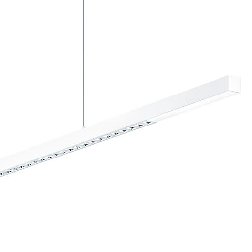 Luminaire suspendu à LED direct-indirect au design épuré, ultramince, avec optique à microréflecteur et commande séparée des composantes directe et indirecte. Solution électrique innovante pour l'alimentation et la commande de l'éclairage par câbles de suspension. Puissance du luminaire: 47,1 W LED, Luminaire pilotable via DALI (via DALI uniquement) avec convertisseur à LED. Durée de vie des LED : 50000 h jusqu'à une diminution du flux lumineux à 95 % de la valeur initiale. Tolérance de la couleur (MacAdam intial): 3. Flux lumineux du luminaire: 5970 lm, Efficacité lumineuse du luminaire: 127 lm/W.Rendu des couleurs Ra > 80, température de couleur 3000 K. Distribution indirecte/directe dans le rapport 65:35. Défilement selon EN 12464-2011 avec L65 < 2000 cd/m² et UGR < 16 pour postes de travail informatisés. Guidage du flux direct via l'optique à microréflecteur en matière composite de haute qualité. Guidage du flux indirect via optique spéciale à distribution extensive, uniforme. Réflecteur avec surface à facettes uniformément aluminisée avec de l'aluminium extrapur extrêmement réflechissant Laque microstructurée, argenté brillant. Corps en profilé d'aluminium extrudé carré d'une section de 25 x 25 mm, embouts invisibles vissés en aluminium moulé sous pression dans la couleur du luminaire blanc. Dimensions du luminaire : 1474 x 25 x 25 mm. Câble de suspension prémonté de 3000 mm de longueur, peut être coupé à la longueur voulue. Boîtier d'appareillages pour montage apparent au plafond, blanc. Boîtier d'appareillages externe pour installation en saillie (béton). Dimensions : 787 x 50 x 25 mm. Luminaire avec câble exempt d'halogène. Poids : 5 kg.