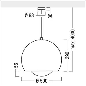 Luminaire suspendu de forme sphérique ; lampe : 1 lampe LED (retrofit) ; douille : E 27 ; sphère en Polycarbonate (PC) avec reflets miroités partiellement transparents en bronze ; effet lumineux : le reflet miroité partiellement transparent procure plasticité et profondeur ; cache-piton chromé mat ; câble de suspension transparent ; raccordement par bornier tripolaire ; tension d'alimentation : 230 V /50 Hz ; classe de protection : I ; sphère intérieure opale pour donner un effet de profondeur et pour le défilement (à commander séparément, voir rubrique Accessoires). Recommandation : utilisation de lampes LED (retrofit), utilisation d'ampoules d'usage général A60 possibles jusqu'à max. 60 W ; Dimensions : Ø500 mm, longueur totale env. 4 m ; poids : 2,8 kg;Note : illustration et schéma coté présentés avec sphère intérieure