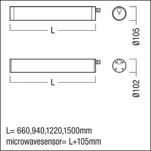 Luminaire tubulaire avec ø 105 mm, Flux lumineux du luminaire: 12148 lm, Efficacité lumineuse du luminaire: 146 lm/W. Rendu des couleurs Ra > 80, température de couleur 4000 K. Puissance du luminaire: 83 W, avec convertisseur à LED ; durée de vie des LED de 80000 h jusqu’à une diminution du flux lumineux de 90 % de la valeur initiale.. Adapté à un montage au mur et au plafond. Autorisé pour une utilisation en intérieur et à l’extérieur dans des zones protégées des intempéries. Température ambiante : -20°C à +30°C. Boîtier résistant aux impacts (IK10). Boîtier en Polycarbonate (PC), opal avec bouchons en Polycarbonate (PC) transparents. Passe-câbles à vis en Polycarbonate (PC) gris et inaltérable. Joints en mousse de polyuréthane. Support d’appareillage en aluminium, thermopoudré blanc mat. Livraison avec 2 brides de fixation en acier inoxydable (22171604). Luminaire avec câble exempt d'halogène. Le luminaire est livré avec un câble H07RN-F de 1,5 m. Degré de protection : IP68. SC1. Dimensions : Ø105 x 1500 mm poids : 3,6 kg.