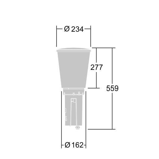 Colonne lumineuse étroite avec 18 LED alimentées en 250mA et distribution lumineuse Confort symétrique radial. Flux fixe Driver. Classe électrique II, IP66, IK10. Couvercle : aluminium fonderie (EN AC-44300). Finition : aluminium thermopoudré, gris anthracite 900 sablé texturé. Diffuseur : Polycarbonate (PC) anti-UV transparent. Pré-câblé avec 3 m de câble. Colonne à commander séparément. Livré avec LED 3 000 K.Dimensions : Ø234 x 559 mmPuissance du luminaire: 15 WPoids : 4,84 kgScx : 0.06 m²Efficacité lumineuse du luminaire: 104 lm/W