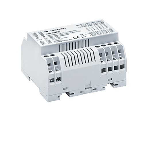 Entrées de détection préconfigurées pour le traitement simultané des signaux de quatre sondes météorologiques conventionnelles : vitesse du vent, direction du vent, température extérieure et précipitations. Raccordement au réseau et au bus, côté entrée: quatre entrées spécifiques pour signaux de sonde. Les signaux de mesure sont convertis selon le type de sonde dans la grandeur physique correspondante : °C, km/h, etc., puis transmis via le bus au système de gestion de l'éclairage et des pièces. Raccordements par bornes à visser ; boîtiers en polycarbonate ignifugé exempt d'halogène pour montage en armoire électrique, convient pour le montage sur rail normalisé selon EN 50022, température ambiante admissible de -0 à +50 °C, degré de protection IP20, dimensions : 105 x 90 x 59 mm, 6 TE á 17,5 mm.