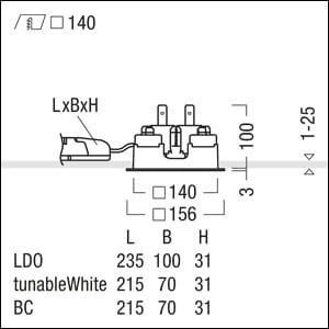 Plafonnier à diodes encastré (luminaire complet) ; pose en cas de place limitée au plafond : profondeur d'encastrement < 100 mm ; luminaire à LED « tunable White » avec modification dynamique de la température de couleur, le flux lumineux restant constant, réglable via signal DALI (DT8 standard) ; répartition lumineuse symétrique extensive avec efficacité maximale du luminaire et technique d'éclairage optimale ; lampe : LED1800-927-65 ; Rendu des couleurs Ra > 90, température de couleur (tunable) 2700-6500 K (blanc chaud-blanc neutre-blanc lumière du jour) ; Tolérance de la couleur (MacAdam intial): 3 ; Puissance du luminaire: 23 W ; Flux lumineux du luminaire: 1850 lm, Efficacité lumineuse du luminaire: 80 lm/W ; durée de vie : 50000 h avec 80% du flux lumineux ; avec unité à ballasts Luminaire pilotable via DALI (via DALI uniquement) séparée ; plage de gradation : 1-100%, « Fade-to Zero » inclus ; unité réflecteur haut de gamme fixée sur la chambre lumineuse modulaire à LED par système d'encliquetage ; chambre lumineuse à LED extrêmement efficace intégrée dans la gestion thermique passive optimisée en fonderie d'aluminium ; réflecteur : , à facettes, aluminisé, grand brillant, sans irisation ; réflecteur/cadre de recouvrement formant une unité en Polycarbonate (PC) de haute qualité résistant aux UV ; Cadre de recouvrement blanc ; amovible ; cadre d'encastrement en fonderie d'aluminium ; montage rapide sans outil de l'unité d'éclairage par fermeture EASY-CLICK ; IP20 ; filerie sans halogène ; raccordement : Bornier à 5 pôles à enfichage, possibilité de repiquage ; tension secteur : 220-240V / 0/50/60Hz, compatible avec une unité centrale de batterie de 220 Vcc ; montage rapide sans outil par clips de fixation pour plafonds de 1-25 mm ; découpe de plafond : 140x140mm, profondeur d'encastrement : 100 mm ; poids : 1,05 kg.Note : pour applications bureautiques selon EN12464 (UGR<19, réflecteur aluminisé), un cadre de défilement supplémentaire doit être commandé séparément !