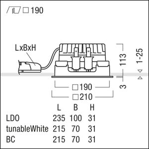 Plafonnier à diodes encastré (luminaire complet) ; luminaire à LED « tunable White » avec modification dynamique de la température de couleur, le flux lumineux restant constant, réglable via signal DALI (DT8 standard) ; distribution lumineuse symétrique extensive avec une efficacité maximale du luminaire et une technique d'éclairage optimale° ; lampe : LED2500-927-65 ; Rendu des couleurs Ra > 90, température de couleur (tunable) 2700-6500 K (blanc chaud-blanc neutre-blanc lumière du jour) ; Tolérance de la couleur (MacAdam intial): 3 ; Puissance du luminaire: 29 W ; Flux lumineux du luminaire: 2400 lm, Efficacité lumineuse du luminaire: 83 lm/W ; durée de vie : 50000 h avec 80% du flux lumineux ; avec unité à ballasts Luminaire pilotable via DALI (via DALI uniquement) séparée ; plage de gradation : 1-100%, « Fade-to Zero » inclus ; unité optique modulaire haut de gamme fixée sur la chambre lumineuse à LED par un système d'encliquetage, chambre lumineuse à LED extrêmement efficace intégrée dans la gestion thermique passive optimisée en fonderie d'aluminium ; réflecteur : lisse, laqué blanc ; réflecteur/cadre de recouvrement en Polycarbonate (PC) de haute qualité résistant aux UV ; Cadre de recouvrement blanc amovible ; cadre d'encastrement en fonderie d'aluminium ; montage rapide sans outil de l'unité d'éclairage par fermeture EASY-CLICK ; IP44_IP20 ; filerie sans halogène ; raccordement : Bornier à 5 pôles à enfichage, possibilité de repiquage ; tension secteur : 220-240V / 0/50/60Hz, compatible avec une unité centrale de batterie de 220 Vcc ; montage rapide sans outil par clips de fixationpour plafonds de 1-25 mm ; découpe de plafond : 190x190mm, profondeur d'encastrement : 123mm; poids : 1,5 kgNote : UGR<19 (réflecteur aluminisé) pour applications bureautiques selon EN12464