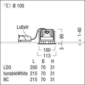 Plafonnier à diodes encastré (lèche-mur) ; luminaire à LED « TunableWhite » avec modification dynamique de la température de couleur tout en ayant un flux lumineux constant, réglable via le signal DALI (DT8 standard) ; distribution lumineuse asymétrique avec une efficacité maximale du luminaire et une technique d'éclairage optimale ; équipement : LED1300-927-65 ; Rendu des couleurs Ra > 90, température de couleur (tunable) 2700-6500 K (blanc chaud - blanc neutre - blanc lumière du jour); Tolérance de la couleur (MacAdam intial): 3 ; Puissance du luminaire: 19 W ; Flux lumineux du luminaire: 1200 lm, Efficacité lumineuse du luminaire: 63 lm/W ; durée de vie : 50000 h avec 80% du flux lumineux ; avec unité à ballast Luminaire pilotable via DALI (via DALI uniquement) ; plage de gradation : 1-100% ; avec « Fade-to Zero » ; avec unité optique modulaire haut de gamme composée d’un réflecteur et d’une chambre lumineuse à LED intégrée dans la gestion thermique optimisée en fonderie d'aluminium ; réflecteur lisse aluminisé, haut brillant, sans irisation avec lentille ovalisante supplémentaire ; réflecteur/collerette en Polycarbonate (PC) de haute qualité, résistant aux UV ; Collerette blanche ; collerette d’encastrement en Polycarbonate renforcé aux fibres de verre (PC), gris ; montage rapide sans outil de l'unité d’éclairage grâce à la fermeture à baïonnette ; IP20 ; câblage du luminaire sans halogène ; raccordement : Bornier à 5 pôles à enfichage, Câblage en dérivation possible ; tension secteur : 220-240V/ 0/50/60Hz ; montage rapide sans outil à l'aide de clips de fixation anti-dérapants pour épaisseurs de plafond de 1 à 40 mm ; découpe du plafond : 100 mm, profondeur d'encastrement : 125 mm (épaisseurs de plafond de 1 à 15 mm) ; poids : 0,67 kg