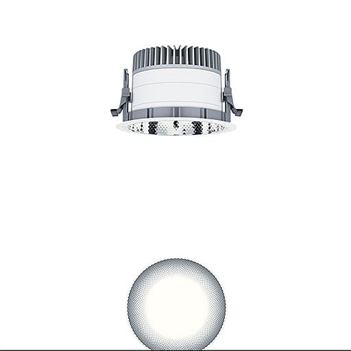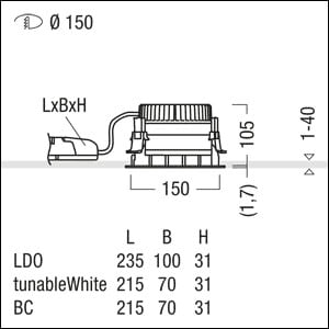 Plafonnier à diodes encastré sans cadre de recouvrement « trimless », luminaire à LED « TunableWhite » avec modification dynamique de la température de couleur tout en ayant un flux lumineux constant, réglable via le signal DALI (DT8 standard) ; distribution lumineuse symétrique extensive avec une efficacité maximale du luminaire et une technique d'éclairage optimale ; équipement : LED1800-927-65 ; Rendu des couleurs Ra > 90, température de couleur (tunable) 2700-6500 K (blanc chaud - blanc neutre - blanc lumière du jour); Tolérance de la couleur (MacAdam intial): 3 ; Puissance du luminaire: 23 W ; Flux lumineux du luminaire: 1800 lm, Efficacité lumineuse du luminaire: 78 lm/W ; durée de vie : 50000 h avec 80% du flux lumineux ; avec unité à ballast séparée Luminaire pilotable via DALI (via DALI uniquement) ; plage de gradation : 1-100% ; avec « Fade-to Zero » ; unité réflecteur haut de gamme se fixant sur la chambre lumineuse modulaire à LED grâce à la fermeture à baïonnette, chambre lumineuse à LED extrêmement efficace intégrée dans la gestion thermique passive optimisée en fonderie d'aluminium ; réflecteur : , à facettes, aluminisé, grand brillant, sans irisation ; réflecteur en Polycarbonate (PC) de haute qualité, résistant aux UV ; montage rapide sans outil de l'unité d’éclairage grâce à la fermeture à baïonnette ; IP20 ; câblage du luminaire sans halogène ; raccordement : Bornier à 5 pôles à enfichage, Câblage en dérivation possible ; tension secteur : 220-240V / 0/50/60Hz, compatible avec une unité centrale de batterie de 220 Vcc ; montage rapide sans outil à l'aide de clips de fixation anti-dérapants pour épaisseurs de plafond de 1 à 40 mm ; découpe du plafond : 150 mm, profondeur d'encastrement : 115 mm ; poids : 0,77 kg ;Note : UGR < 19 (réflecteur aluminisé) pour les applications dans les bureaux selon la norme EN12464 ;Note : l’anneau d'arasement (anneau planar) pour l'encastrement du luminaire à ras de plafond doit être commandé séparément (voir accessoires)