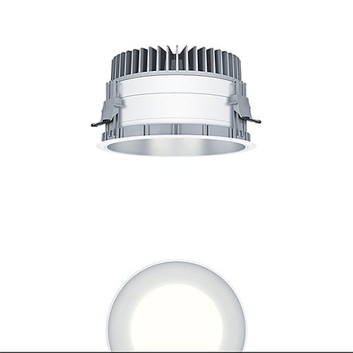 Plafonnier à diodes encastré sans cadre de recouvrement « trimless », luminaire à LED « TunableWhite » avec modification dynamique de la température de couleur tout en ayant un flux lumineux constant, réglable via le signal DALI (DT8 standard) ; distribution lumineuse symétrique extensive avec une efficacité maximale du luminaire et une technique d'éclairage optimale ; équipement : LED2500-927-65 ; Rendu des couleurs Ra > 90, température de couleur (tunable) 2700-6500 K (blanc chaud - blanc neutre - blanc lumière du jour); Tolérance de la couleur (MacAdam intial): 3 ; Puissance du luminaire: 29 W ; Flux lumineux du luminaire: 2100 lm, Efficacité lumineuse du luminaire: 72 lm/W ; durée de vie : 50000 h avec 80% du flux lumineux ; avec unité à ballast séparée Luminaire pilotable via DALI (via DALI uniquement) ; plage de gradation : 1-100% ; avec « Fade-to Zero » ; unité réflecteur haut de gamme se fixant sur la chambre lumineuse modulaire à LED grâce à la fermeture à baïonnette, chambre lumineuse à LED extrêmement efficace intégrée dans la gestion thermique passive optimisée en fonderie d'aluminium ; réflecteur : lisse, à revêtement mat teinté aluminium ; réflecteur en Polycarbonate (PC) de haute qualité, résistant aux UV ; montage rapide sans outil de l'unité d’éclairage grâce à la fermeture à baïonnette ; IP20 ; câblage du luminaire sans halogène ; raccordement : Bornier à 5 pôles à enfichage, Câblage en dérivation possible ; tension secteur : 220-240V / 0/50/60Hz, compatible avec une unité centrale de batterie de 220 Vcc ; montage rapide sans outil à l'aide de clips de fixation anti-dérapants pour épaisseurs de plafond de 1 à 40 mm ; découpe du plafond : 200 mm, profondeur d'encastrement : 131 mm ; poids : 1,29 kg ;Note : UGR < 19 (réflecteur aluminisé) pour les applications dans les bureaux selon la norme EN12464Note : l’anneau d'arasement (anneau planar) pour l'encastrement du luminaire à ras de plafond doit être commandé séparément (voir accessoires)