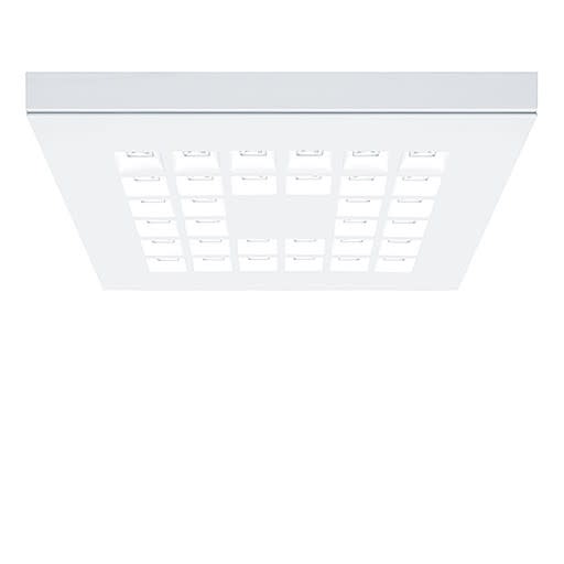 Plafonnier apparent à LED plat et modulaire, avec optique à lentille. Puissance du luminaire: 17,4 W, Luminaire pilotable via DALI (via DALI uniquement) avec convertisseur à LED ; durée de vie des LED : après 100000 h, diminution du flux lumineux jusqu'à 95 % de la valeur initiale. Tolérance de la couleur (MacAdam intial): 3. Flux lumineux du luminaire: 2700 lm, Efficacité lumineuse du luminaire: 155 lm/W. Rendu des couleurs Ra > 80, température de couleur 3000 K. Guidage du flux par optique à lentille carrée, répartition sans éblouissement UGR < 16 et L65 < 1000 cd/m² conforme à EN 12464:2011 ; peu sensible à la poussière et nettoyage facile ; corps du luminaire plat en tôle d'acier thermopoudré blanc ; ; hauteur visible du luminaire de 52 mm. Luminaire avec câble exempt d'halogène ; ; Dimensions : 600 x 600 x 52 mm, poids : 6,64 kg