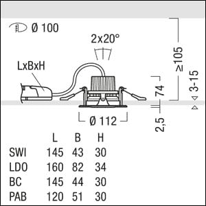 Plafonnier encastré à LED miniaturisé pour un éclairage de mise en valeur puissant ; distribution lumineuse avec un bon contrôle de l’éblouissement ; équipement : 1/21 W, Rendu des couleurs Ra > 90, température de couleur 2700 K, blanc chaud ; (32 °) Distribution lumineuse WIDEFLOOD ; réflecteur argenté avec bord décoratif noir ; Tolérance de la couleur (MacAdam intial): 3 ; Flux lumineux du luminaire: 1600 lm, Efficacité lumineuse du luminaire: 76 lm/W ; durée de vie : 50000 h avec 80% du flux lumineux ; modèle complet comprenant un luminaire et une unité à ballast, Luminaire pilotable via DALI (via DALI uniquement) ; tête d’éclairage orientable de ± 20° ; boîtier en fonderie d'aluminium, collerette Aluminium brossé ; réflecteur à facettes en aluminium, argent grand brillant ; câblage du luminaire sans halogène ; raccordement : Bornier à 5 pôles ; Puissance du luminaire: 21 W ; tension secteur : 220-240V/ 0/50/60Hz ; montage sans outil à l'aide de deux clips de fixation pour épaisseurs de plafond de 3 à 15 mm ; découpe du plafond : Ø 100 mm, profondeur d'encastrement : 110 mm ; poids : 0,55 kgNote : Différentes combinaisons de couleurs (personnalisation du design) des différents composants possibles grâce à la structure modulaire. Peuvent être commandées en tant que variante via myMICROS ;Montage dans des plafonds fermés grâce à des accessoires en option à commander séparément !