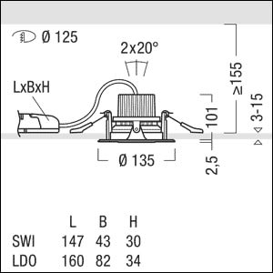 Plafonnier encastré à LED pour un éclairage de mise en valeur puissant ; distribution lumineuse avec un bon contrôle de l’éblouissement ; équipement : 1/29 W, Rendu des couleurs Ra > 90, température de couleur 3000 K, blanc chaud ; (36 °) Distribution lumineuse WIDEFLOOD ; réflecteur argenté avec bord décoratif noir ; Tolérance de la couleur (MacAdam intial): 3 ; Flux lumineux du luminaire: 2500 lm, Efficacité lumineuse du luminaire: 86 lm/W ; durée de vie : 50000 h avec 80% du flux lumineux ; modèle complet comprenant un luminaire et une unité à ballast, Luminaire commutable on/off ; tête d’éclairage orientable de ± 20° ; boîtier en fonderie d'aluminium, collerette d’encastrement noir ; réflecteur à facettes en aluminium, noir grand brillant ; câblage du luminaire sans halogène ; raccordement : Bornier bipolaire ; Puissance du luminaire: 29 W ; tension secteur : 220-240V/ 0/50/60Hz ; montage sans outil à l'aide de deux clips de fixation pour épaisseurs de plafond de 3 à 15 mm ; découpe du plafond : Ø 125 mm, profondeur d'encastrement : 155 mm ; poids : 0,9 kg Note : Différentes combinaisons de couleurs (personnalisation du design) des différents composants possibles grâce à la structure modulaire. Peuvent être commandées en tant que variante via myMICROS ;