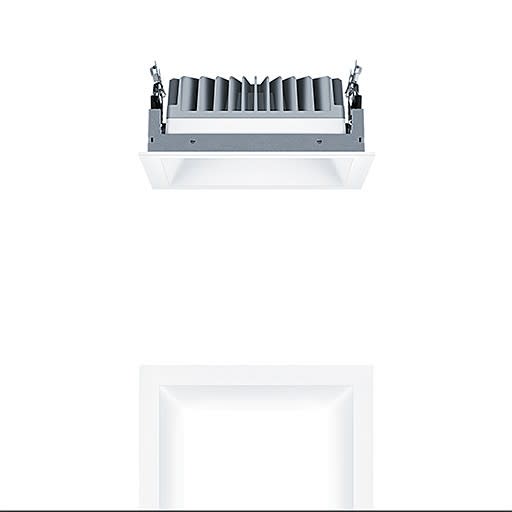 Plafonnier encastré à LED (luminaire complet) ; pour une profondeur d'encastrement au plafond de seulement 100 mm ; luminaire à LED stableWhite à distribution extensive symétrique du flux avec une excellente efficacité lumineuse et une technique d'éclairage optimale ; lampe : 19 W LED840 ; Rendu des couleurs Ra > 80, température de couleur 4000 K (blanc neutre) ; Tolérance de la couleur (MacAdam intial): 3 ; Flux lumineux du luminaire: 2587 lm, Efficacité lumineuse du luminaire: 136 lm/W. Durée de vie : 50000 h à 85 % du flux lumineux ; Luminaire pilotable via DALI (via DALI uniquement) avec unité à ballasts séparée ; réflecteur de qualité encliqueté sur la cellule lumineuse modulaire à LED à haute efficacité intégrée dans la gestion thermique passive optimisée en aluminium injecté. Réflecteur : lisse, laqué blanc ; réflecteur/cadre de recouvrement en Polycarbonate (PC) de qualité, résistant aux UV, Cadre de recouvrement blanc, amovible. Cadre d'encastrement en fonderie d'aluminium. Montage rapide sans outil des luminaires par fermeture EASY CLICK ; IP44_IP20 ; luminaire à filerie exempte d'halogène. Raccordement : Bornier à 5 pôles à enfichage, repiquage possible ; tension d'alimentation : 220-240V / 0/50/60Hz, compatible avec une unité centrale de batterie de 220 Vcc. Montage : rapide sans outil par clips de retenue antidérapant pour des épaisseurs de plafond de 1 à 25 mm. Découpe au plafond : 190 mm x 190 mm, profondeur d'encastrement : 100 mm ; poids : 1,43 kg.Note : pour les applications de bureau selon la norme EN12464 (UGR<19, réflecteur aluminisé), commander séparément un cadre de défilement supplémentaire.