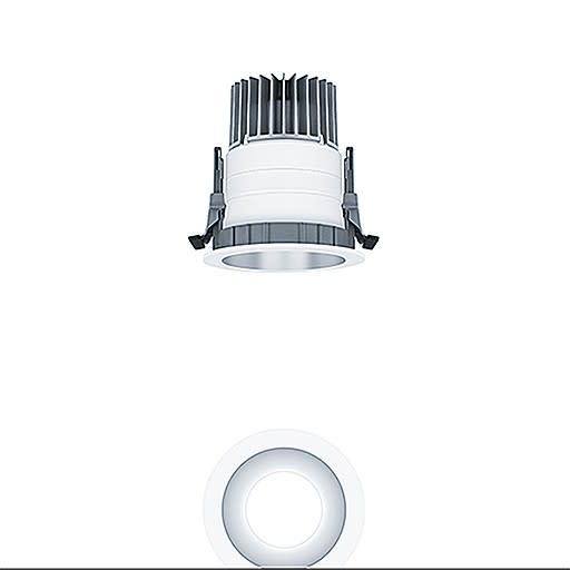 Plafonnier encastré à LED (luminaire complet ), « Stable White » ; angle de défilement de 45° ; équipement : 15 W LED840 ; Rendu des couleurs Ra > 80, température de couleur 4000 K (blanc neutre) ; Tolérance de la couleur (MacAdam intial): 3 ; Flux lumineux du luminaire: 1330 lm, Efficacité lumineuse du luminaire: 89 lm/W ; durée de vie : 50000 h avec 85% du flux lumineux ; avec unité à ballast Luminaire pilotable via DALI (via DALI uniquement) ; avec unité optique modulaire haut de gamme composée d’un réflecteur et d’une chambre lumineuse à LED intégrée dans la gestion thermique optimisée en fonderie d'aluminium ; réflecteur lisse à revêtement mat teinté aluminium ; réflecteur/collerette en Polycarbonate (PC) de haute qualité, résistant aux UV ; Collerette blanche ; collerette d’encastrement en Polycarbonate renforcé aux fibres de verre (PC), gris ; montage rapide sans outil de l'unité d’éclairage grâce à la fermeture à baïonnette ; IP20 ; câblage du luminaire sans halogène ; raccordement : Bornier à 5 pôles à enfichage ; Câblage en dérivation possible ; tension secteur : 220-240V / 0/50/60Hz, compatible avec une unité centrale de batterie de 220 Vcc ; montage rapide sans outil à l'aide de clips de fixation anti-dérapants pour épaisseurs de plafond de 1 à 40 mm ; découpe du plafond : 100 mm, profondeur d'encastrement : 140 mm ; poids : 0,52 kg ;Note : UGR < 19 pour les applications dans les bureaux selon la norme EN12464 (en fonction du type de luminaire)