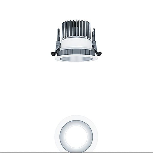 Plafonnier encastré à LED (luminaire complet ), « Stable White » ; angle de défilement de 60° ; équipement : 15 W LED827 ; 57 ° ; Rendu des couleurs Ra > 80, température de couleur 2700 K (blanc chaud) ; Tolérance de la couleur (MacAdam intial): 3 ; Flux lumineux du luminaire: 1318 lm, Efficacité lumineuse du luminaire: 88 lm/W ; durée de vie : 50000 h avec 85% du flux lumineux ; avec unité à ballast ; avec unité optique modulaire haut de gamme composée d’un réflecteur et d’une chambre lumineuse à LED intégrée dans la gestion thermique optimisée en fonderie d'aluminium ; réflecteur lisse à revêtement mat teinté aluminium ; réflecteur/collerette en Polycarbonate (PC) de haute qualité, résistant aux UV ; Collerette blanche ; collerette d’encastrement en Polycarbonate renforcé aux fibres de verre (PC), gris ; montage rapide sans outil de l'unité d’éclairage grâce à la fermeture à baïonnette ; IP44_IP20 ; câblage du luminaire sans halogène ; raccordement : Bornier tripolaire à enfichage ; Câblage en dérivation possible ; tension secteur : 220-240V / 0/50/60Hz, compatible avec une unité centrale de batterie de 220 Vcc ; montage rapide sans outil à l'aide de clips de fixation anti-dérapants pour épaisseurs de plafond de 1 à 40 mm ; découpe du plafond : 100 mm, profondeur d'encastrement : 110 mm pour des épaisseurs de plafond comprises entre 1 et 15 mm ; poids : 0,49 kg ;Note : UGR < 19 pour les applications dans les bureaux selon la norme EN12464 (en fonction du type de luminaire)