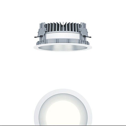 Plafonnier encastré à LED (luminaire complet ) ; à utiliser en cas d'espace réduit dans le plafond : profondeur d'encastrement < 100 mm ; luminaire à LED « StableWhite » à distribution symétrique extensive avec efficacité maximale du luminaire et technique lumineuse optimale ; équipement : 15 W LED830 ; Rendu des couleurs Ra > 80, température de couleur 3000 K (blanc chaud) ; Tolérance de la couleur (MacAdam intial): 3 ; Flux lumineux du luminaire: 1800 lm, Efficacité lumineuse du luminaire: 120 lm/W ; durée de vie : 50000 h avec 85% du flux lumineux ; avec unité à ballast séparée ; avec unité réflecteur haut de gamme se fixant sur la chambre lumineuse modulaire à LED grâce à la fermeture à baïonnette ; chambre lumineuse à LED extrêmement efficace intégrée dans la gestion thermique passive optimisée en aluminium injecté sous pression ; réflecteur : lisse, à revêtement mat teinté aluminium ; réflecteur/collerette formant une unité en Polycarbonate (PC) de haute qualité, résistant aux UV ; Collerette blanche ; collerette d’encastrement en Polycarbonate renforcé aux fibres de verre (PC), gris ; montage rapide sans outil de l'unité d’éclairage grâce à la fermeture à baïonnette ; IP44_IP20 ; câblage du luminaire sans halogène ; raccordement : Bornier tripolaire à enfichage; ; ; Câblage en dérivation possible ; tension secteur : 220-240V / 0/50/60Hz, compatible avec une unité centrale de batterie de 220 Vcc ; montage rapide sans outil à l'aide de clips de fixation anti-dérapants pour épaisseurs de plafond de 1 à 40 mm ; découpe du plafond : 200 mm, profondeur d'encastrement : 89 mm ; poids : 1,21 kg ;Note : pour les applications dans les bureaux selon la norme EN12464 (UGR < 19, réflecteur aluminisé), une collerette de défilement supplémentaire doit être commandée séparément
