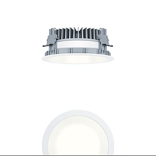 Plafonnier encastré à LED (luminaire complet ) ; à utiliser en cas d'espace réduit dans le plafond : profondeur d'encastrement < 100 mm ; luminaire à LED « StableWhite » à distribution symétrique extensive avec efficacité maximale du luminaire et technique lumineuse optimale ; équipement : 15 W LED830 ; Rendu des couleurs Ra > 80, température de couleur 3000 K (blanc chaud) ; Tolérance de la couleur (MacAdam intial): 3 ; Flux lumineux du luminaire: 1890 lm, Efficacité lumineuse du luminaire: 126 lm/W ; durée de vie : 50000 h avec 85% du flux lumineux ; avec unité à ballast séparée ; avec unité réflecteur haut de gamme se fixant sur la chambre lumineuse modulaire à LED grâce à la fermeture à baïonnette ; chambre lumineuse à LED extrêmement efficace intégrée dans la gestion thermique passive optimisée en aluminium injecté sous pression ; réflecteur : lisse, laqué blanc ; réflecteur/collerette formant une unité en Polycarbonate (PC) de haute qualité, résistant aux UV ; Collerette blanche ; collerette d’encastrement en Polycarbonate renforcé aux fibres de verre (PC), gris ; montage rapide sans outil de l'unité d’éclairage grâce à la fermeture à baïonnette ; IP44_IP20 ; câblage du luminaire sans halogène ; raccordement : Bornier tripolaire à enfichage; ; ; Câblage en dérivation possible ; tension secteur : 220-240V / 0/50/60Hz, compatible avec une unité centrale de batterie de 220 Vcc ; montage rapide sans outil à l'aide de clips de fixation anti-dérapants pour épaisseurs de plafond de 1 à 40 mm ; découpe du plafond : 200 mm, profondeur d'encastrement : 89 mm ; poids : 1,21 kg ;Note : pour les applications dans les bureaux selon la norme EN12464 (UGR < 19, réflecteur aluminisé), une collerette de défilement supplémentaire doit être commandée séparément