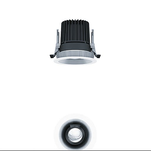 Plafonnier encastré à LED (luminaire complet réglable), avec technologie à lentille innovante ; réglage intuitif sans outil du cône d'éclairement par deux lentilles orientables en PMMA lorsque le luminaire est allumé ; cône d'éclairement orientable sur 360° dans le plan horizontal et sur 30° dans le plan vertical : répartition homogène de la lumière avec une intensité élevée des luminaires ; système d'éclairage fermé produisant un éclairage apaisant du plafond indépendant de l'orientation réglée pour la lumière. Lampe : 15 W LED930, Caractéristique photométrique spot ; réflecteur : lisse, à revêtement teinté aluminium et mat (15 °) ; Rendu des couleurs Ra > 90, température de couleur 3000 K (blanc chaud ; Tolérance de la couleur (MacAdam intial): 3 ; Flux lumineux du luminaire: 470 lm, Efficacité lumineuse du luminaire: 31 lm/W. Durée de vie : 50000 h avec 85 % du flux lumineux ; avec unité à ballast séparée Luminaire pilotable via DALI (via DALI uniquement) ; unité optique haut de gamme intégrée dans la gestion thermique optimisée en fonderie d'aluminium ; réflecteur/collerette en Polycarbonate (PC) de qualité, résistant aux UV ; Collerette blanche ; collerette en Polycarbonate renforcé aux fibres de verre (PC), gris ; montage rapide sans outil du luminaire par fermeture à baïonnette ; IP20 ; luminaire à filerie exempte d'halogène ; raccordement : Bornier à 5 pôles à enfichage ; possibilité de repiquage ; tension d'alimentation : 220-240V / 0/50/60Hz. Montage rapide sans outil à l'aide de clips de montage pour plafonds d'une épaisseur de 1 à 40 mm ; découpe du plafond : 100, profondeur d'encastrement : 125 mm ; poids : 0,67 kg