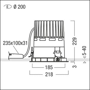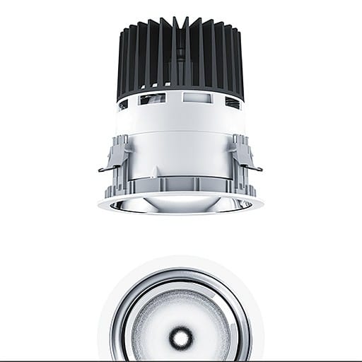 Plafonnier encastré à LED (Komplettleuchte) ; flux lumineux élevé pour de grandes hauteurs sous plafond ; luminaire à LED « StableWhite » avec technique lumineuse optimale et distribution photométrique symétrique ; équipement : 62 W LED927 ; Rendu des couleurs Ra > 90, température de couleur 2700 K (blanc chaud) ; Tolérance de la couleur (MacAdam intial): 3 ; Flux lumineux du luminaire: 4900 lm, Efficacité lumineuse du luminaire: 79 lm/W ; durée de vie : 50000h avec 80% du flux lumineux ; avec unité à ballast pilotable (graduable uniquement avec Dali / switchDim), unité séparée reliée au luminaire par un système de connecteurs ; transition harmonieuse entre la chambre lumineuse et le réflecteur de haute qualité ; gestion thermique passive optimisée en fonderie d'aluminium, noir ; unité réflecteur en deux parties et en Polycarbonate (PC) de haute qualité, résistant aux UV ; élément supérieur du réflecteur : Caractéristique photométrique spot ; réflecteur : à facettes, aluminisé, grand brillant et sans irisation (13 °), avec verre structuré monocouche de sécurité ; élément inférieur du réflecteur / collerette : lisse, aluminisé, haut brillant, sans irisation, Collerette blanche ; IP20 ; câblage du luminaire sans halogène ; raccordement : Bornier à 5 pôles à enfichage, possibilité de câblage en dérivation ; tension secteur : 220-240 V - 0 / 50 / 60 Hz, compatible avec une batterie centrale 220 V DC conformément à la norme EN 60598-2-22, niveau de puissance d'urgence préréglé sur 15 % (programmable en usine entre 1 et 100 %) ; montage : collerette d’encastrement en Polycarbonate renforcé aux fibres de verre (PC), gris avec clips de fixation anti-dérapants pour l'encastrement sans outil dans les plafonds d'une épaisseur de 5 à 40 mm ; découpe au plafond : 200 mm, profondeur d'encastrement : 250 mm + épaisseurs de plafond ; montage rapide sans outil de l'unité d’éclairage grâce à la fermeture à baïonnette simplifiée ; poids : 2,98 kg ; disponible également sans cadre de recouvrement « trimless » (TL) ! Note : pour les applications dans les bureaux selon la norme EN12464 (UGR < 19, réflecteur aluminisé), une collerette de défilement supplémentaire doit être commandée séparément
