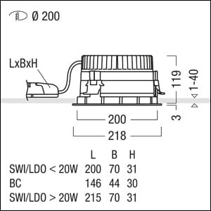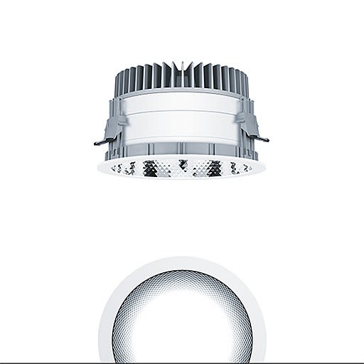 Plafonnier encastré à LED (luminaire complet ) ; luminaire à LED « StableWhite » à distribution symétrique extensive avec efficacité maximale du luminaire et technique lumineuse optimale ; équipement : LED5000-840 ; (blanc neutre) ; Tolérance de la couleur (MacAdam intial): 2 ; Flux lumineux du luminaire: 5100 lm, Efficacité lumineuse du luminaire: 121 lm/W ; durée de vie : 50000 h avec 85% du flux lumineux ; avec unité à ballast séparée ; avec unité réflecteur haut de gamme se fixant sur la chambre lumineuse modulaire à LED grâce à la fermeture à baïonnette ; chambre lumineuse à LED extrêmement efficace intégrée dans la gestion thermique passive optimisée en aluminium injecté sous pression ; réflecteur : lisse, à facettes, aluminisé, grand brillant, sans irisation ; réflecteur/collerette formant une unité en Polycarbonate (PC) de haute qualité, résistant aux UV ; Collerette blanche ; collerette d’encastrement en Polycarbonate renforcé aux fibres de verre (PC), gris ; montage rapide sans outil de l'unité d’éclairage grâce à la fermeture à baïonnette ; IP44_IP20 ; câblage du luminaire sans halogène ; raccordement : Bornier bipolaire; ; ; Câblage en dérivation possible ; tension secteur : 220-240V / 0/50/60Hz, compatible avec une unité centrale de batterie de 220 Vcc ; montage rapide sans outil à l'aide de clips de fixation anti-dérapants pour épaisseurs de plafond de 1 à 40 mm ; découpe du plafond : 200 mm, profondeur d'encastrement : 129 mm ; poids : 1,39 kg ;