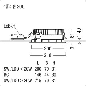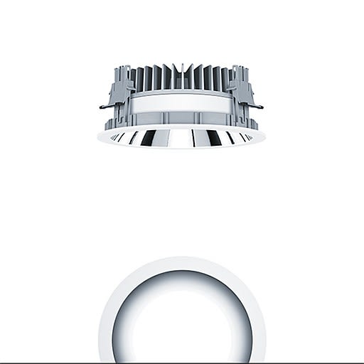Plafonnier encastré à LED (luminaire complet ) ; à utiliser en cas d'espace réduit dans le plafond : profondeur d'encastrement < 100 mm ; luminaire à LED « StableWhite » à distribution symétrique extensive avec efficacité maximale du luminaire et technique lumineuse optimale ; équipement : LED3500-840 ; Rendu des couleurs Ra > 80, température de couleur 4000 K (blanc neutre) ; Tolérance de la couleur (MacAdam intial): 2 ; Flux lumineux du luminaire: 3500 lm, Efficacité lumineuse du luminaire: 125 lm/W ; durée de vie : 50000 h avec 85% du flux lumineux ; avec unité à ballast séparée Luminaire commutable on/off ; avec unité réflecteur haut de gamme se fixant sur la chambre lumineuse modulaire à LED grâce à la fermeture à baïonnette ; chambre lumineuse à LED extrêmement efficace intégrée dans la gestion thermique passive optimisée en aluminium injecté sous pression ; réflecteur : lisse, aluminisé, haut brillant, sans irisation ; réflecteur/collerette formant une unité en Polycarbonate (PC) de haute qualité, résistant aux UV ; Collerette blanche ; collerette d’encastrement en Polycarbonate renforcé aux fibres de verre (PC), gris ; montage rapide sans outil de l'unité d’éclairage grâce à la fermeture à baïonnette ; IP44_IP20 ; câblage du luminaire sans halogène ; raccordement : Bornier tripolaire à enfichage; ; ; Câblage en dérivation possible ; tension secteur : 220-240V / 0/50/60Hz, compatible avec une unité centrale de batterie de 220 Vcc ; montage rapide sans outil à l'aide de clips de fixation anti-dérapants pour épaisseurs de plafond de 1 à 40 mm ; découpe du plafond : 200 mm, profondeur d'encastrement : 89 mm ; poids : 1,3 kg ;Note : pour les applications dans les bureaux selon la norme EN12464 (UGR < 19, réflecteur aluminisé), une collerette de défilement supplémentaire doit être commandée séparément