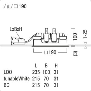 Plafonnier encastré à LED sans cadre de recouvrement « trimless », à utiliser en cas d'espace réduit dans le plafond : profondeur d'encastrement de seulement 100 mm ; luminaire à LED « StableWhite » à distribution symétrique extensive avec efficacité maximale du luminaire et technique lumineuse optimale ; équipement : LED2500-940 ; Rendu des couleurs Ra > 90 (R9 > 50), température de couleur 4000 K (blanc neutre) ; Tolérance de la couleur (MacAdam intial): 2 ; Puissance du luminaire: 19 W ; Flux lumineux du luminaire: 2516 lm, Efficacité lumineuse du luminaire: 132 lm/W ; durée de vie : 100000 h avec 90% du flux lumineux ou 50000 h avec 95% du flux lumineux ; avec unité à ballast séparée Luminaire pilotable via DALI (via DALI uniquement) ; avec unité réflecteur haut de gamme se fixant sur la chambre lumineuse modulaire à LED grâce à la fermeture à encliqueter ; chambre lumineuse à LED extrêmement efficace intégrée dans la gestion thermique passive optimisée en aluminium injecté sous pression ; réflecteur en Polycarbonate (PC) de haute qualité, résistant aux UV ; montage rapide sans outil de l'unité d’éclairage grâce à la fermeture EASY-CLICK ; IP20 ; câblage du luminaire sans halogène ; raccordement : Bornier à 5 pôles à enfichage, possibilité de câblage en dérivation ; tension secteur : 220-240V / 0/50/60Hz, compatible avec une unité centrale de batterie de 220 Vcc ; montage rapide sans outil à l'aide de clips de fixation pour épaisseurs de plafond de 1 à 25 mm ; découpe du plafond : 190 x 190 mm, profondeur d’encastrement : 100 mm ; poids : 1,12 kg ;Note : le cadre d'arasement (cadre planar) pour l'encastrement du luminaire à ras de plafond doit être commandé séparément (voir accessoires). Pour les applications dans les bureaux selon la norme EN12464 (UGR < 19, réflecteur aluminisé), un cadre de défilement supplémentaire doit être commandé séparément