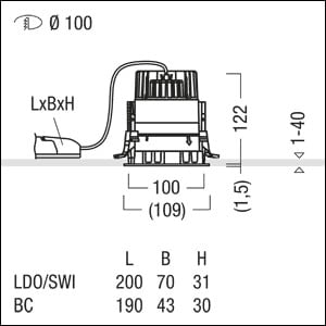 Plafonnier encastré à LED sans cadre de recouvrement « trimless », Stable White ; ; angle de défilement de 45°; équipement : LED1300-927 ; Rendu des couleurs Ra > 90 (R9 > 50), température de couleur 2700 K (blanc chaud) ; Tolérance de la couleur (MacAdam intial): 2 ; Puissance du luminaire: 15 W ; Flux lumineux du luminaire: 1448 lm, Efficacité lumineuse du luminaire: 97 lm/W ; durée de vie : 100000 h avec 90% du flux lumineux ou 50000 h avec 95% du flux lumineux ; avec unité à ballast Luminaire pilotable via DALI (via DALI uniquement) ; avec unité optique modulaire haut de gamme comprenant un réflecteur et une chambre lumineuse à LED intégrée dans la gestion thermique optimisée en fonderie d'aluminium ; réflecteur lisse aluminisé, haut brillant, sans irisation ; réflecteur en Polycarbonate (PC) de haute qualité, résistant aux UV ; montage rapide sans outil de l'unité d’éclairage par fermeture à baïonnette ; IP20 ; câblage du luminaire sans halogène ; raccordement : Bornier à 5 pôles à enfichage; possibilité de câblage en dérivation ; tension secteur : 220-240V / 0/50/60Hz, compatible avec une unité centrale de batterie de 220 Vcc ; montage rapide sans outil à l'aide de clips de fixation anti-dérapants pour épaisseurs de plafond de 1 à 40 mm ; découpe du plafond : 100 mm, profondeur d'encastrement : 140 mm pour des épaisseurs de plafond comprises entre 1 et 15 mm ; poids : 0,55 kg ;Note : UGR < 19 pour les applications dans les bureaux selon la norme EN12464 (en fonction du type de luminaire)Note : l’anneau d'arasement (anneau planar) pour l'encastrement du luminaire à ras de plafond doit être commandé séparément (voir accessoires)