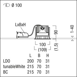 Plafonnier encastré à LED sans cadre de recouvrement « trimless » (lèche-mur), « Stable White » ; à distribution asymétrique avec efficacité maximale du luminaire et technique lumineuse optimale ; équipement : LED1000-930 ; Rendu des couleurs Ra > 90 (R9 > 50), température de couleur 3000 K (blanc chaud) ; Tolérance de la couleur (MacAdam intial): 2 ; Puissance du luminaire: 9 W ; Flux lumineux du luminaire: 925 lm, Efficacité lumineuse du luminaire: 103 lm/W ; durée de vie : 100000 h avec 90% du flux lumineux ou 50000 h avec 95% du flux lumineux ; avec unité à ballast pilotable Luminaire pilotable via DALI (via DALI uniquement) ; avec unité optique modulaire haut de gamme composée d’un réflecteur et d’une chambre lumineuse à LED intégrée dans la gestion thermique optimisée en fonderie d'aluminium ; réflecteur asymétrique lisse aluminisé, haut brillant, sans irisation avec lentille ovalisante supplémentaire ; réflecteur en Polycarbonate (PC) de haute qualité, résistant aux UV ; montage rapide sans outil de l'unité d’éclairage grâce à la fermeture à baïonnette simple ; IP44_IP20 ; câblage du luminaire exempt d'halogène ; raccordement : Bornier à 5 pôles, possibilité de câblage en dérivation ; tension secteur : 220-240V/ 0/50/60Hz ; montage rapide sans outil à l'aide de clips de fixation anti-dérapants pour épaisseurs de plafond de 1 à 40 mm ; découpe du plafond : 100 mm, profondeur d'encastrement min. : 130 mm ; poids : 0,54 kg ;Note : l’anneau d'arasement (anneau planar) pour l'encastrement du luminaire à ras de plafond doit être commandé séparément (voir accessoires)