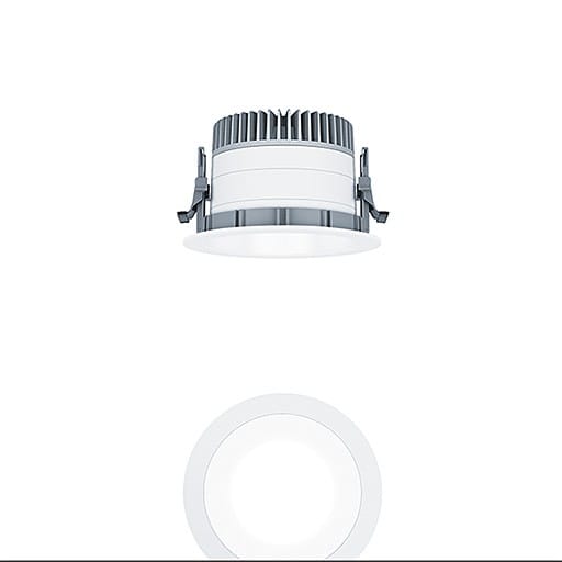 Plafonnier encastré à LED (luminaire complet) ; ; luminaire à LED « StableWhite » à distribution symétrique extensive avec efficacité maximale du luminaire et technique lumineuse optimale ; équipement : LED1800-940 ; Rendu des couleurs Ra > 90 (R9 > 50), température de couleur 4000 K (blanc neutre) ; Tolérance de la couleur (MacAdam intial): 2 ; Puissance du luminaire: 15 W ; Flux lumineux du luminaire: 1732 lm, Efficacité lumineuse du luminaire: 115 lm/W ; durée de vie : 100000 h avec 90% du flux lumineux ou 50000 h avec 95% du flux lumineux ; avec unité à ballast séparée Luminaire pilotable via DALI (via DALI uniquement) ; avec unité réflecteur haut de gamme se fixant sur la chambre lumineuse modulaire à LED grâce à la fermeture à baïonnette ; chambre lumineuse à LED extrêmement efficace intégrée dans la gestion thermique passive optimisée en aluminium injecté sous pression ; réflecteur : lisse, laqué blanc ; réflecteur/collerette formant une unité en Polycarbonate (PC) de haute qualité, résistant aux UV ; Collerette blanche ; collerette d’encastrement en Polycarbonate renforcé aux fibres de verre (PC), gris ; montage rapide sans outil de l'unité d’éclairage grâce à la fermeture à baïonnette ; IP44_IP20 ; câblage du luminaire sans halogène ; raccordement : Bornier à 5 pôles à enfichage; possibilité de câblage en dérivation ; tension secteur : 220-240V / 0/50/60Hz, compatible avec une unité centrale de batterie de 220 Vcc ; montage rapide sans outil à l'aide de clips de fixation anti-dérapants pour épaisseurs de plafond de 1 à 40 mm ; découpe du plafond : 150 mm, profondeur d'encastrement : 113 mm ; poids : 0,84 kg ;Note : UGR < 19 (réflecteur aluminisé) pour les applications dans les bureaux selon la norme EN12464
