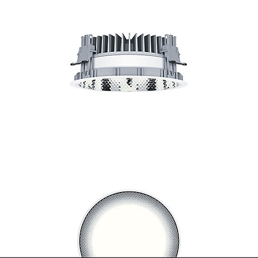 Plafonnier encastré à LED sans cadre de recouvrement « trimless », à utiliser en cas d'espace réduit dans le plafond : profondeur d'encastrement < 100 mm ; luminaire à LED « tunableWhite » avec modification dynamique de la température de couleur tout en ayant un flux lumineux constant, réglable via le signal DALI (DT8 standard) ; distribution lumineuse symétrique extensive avec une efficacité maximale du luminaire et une technique d'éclairage optimale ; équipement : LED1800-927-65 ; Rendu des couleurs Ra > 90, température de couleur (tunable) 2700-6500 K (blanc chaud - blanc neutre - blanc lumière du jour) ; Tolérance de la couleur (MacAdam intial): 3 ; Puissance du luminaire: 23 W ; Flux lumineux du luminaire: 2000 lm, Efficacité lumineuse du luminaire: 87 lm/W ; durée de vie : 50000 h avec 80% du flux lumineux ; avec unité à ballast séparée Luminaire pilotable via DALI (via DALI uniquement) ; plage de gradation : 1-100% ; avec « Fade-to Zero » ; unité réflecteur haut de gamme se fixant sur la chambre lumineuse modulaire à LED grâce à la fermeture à baïonnette, chambre lumineuse à LED extrêmement efficace intégrée dans la gestion thermique passive optimisée en fonderie d'aluminium ; réflecteur : , à facettes, aluminisé, grand brillant, sans irisation ; réflecteur en Polycarbonate (PC) de haute qualité, résistant aux UV ; montage rapide sans outil de l'unité d’éclairage grâce à la fermeture à baïonnette ; IP44_IP20 ; câblage du luminaire sans halogène ; raccordement : Bornier à 5 pôles à enfichage, Câblage en dérivation possible ; tension secteur : 220-240V / 0/50/60Hz, compatible avec une unité centrale de batterie de 220 Vcc ; montage rapide sans outil à l'aide de clips de fixation anti-dérapants pour épaisseurs de plafond de 1 à 40 mm ; découpe du plafond : 200 mm, profondeur d'encastrement : 91 mm ; poids : 1,29 kg ;Note : L’anneau d'arasement (anneau planar) pour l'encastrement du luminaire à ras de plafond doit être commandé séparément (voir accessoires) ; pour les applications dans les bureaux selon la norme EN12464 (UGR < 19, réflecteur aluminisé), un cadre de défilement supplémentaire doit être commandé séparément !