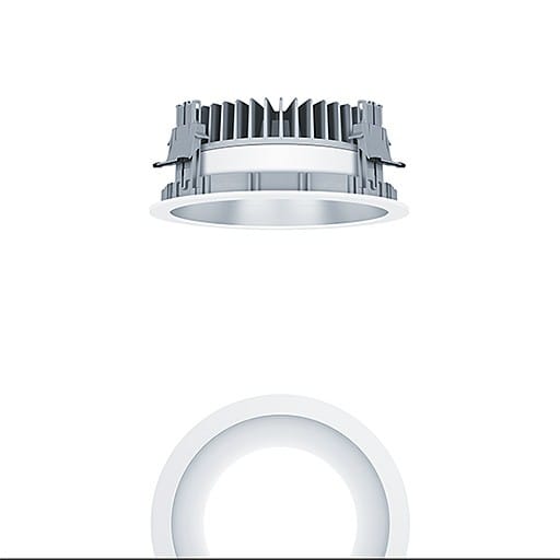 Plafonnier encastré à LED (luminaire complet) ; ; à utiliser en cas d'espace réduit dans le plafond : profondeur d'encastrement < 100 mm ; luminaire à LED « StableWhite » à distribution symétrique extensive avec efficacité maximale du Leuchte} ; Flux lumineux du luminaire: 1882 lm, Efficacité lumineuse du luminaire: 125 lm/W ; durée de vie : 100000 h avec 90% du flux lumineux ou 50000 h avec 95% du flux lumineux ; avec unité à ballast séparée Luminaire pilotable via DALI (via DALI uniquement) ; avec unité réflecteur haut de gamme se fixant sur la chambre lumineuse modulaire à LED grâce à la fermeture à baïonnette ; chambre lumineuse à LED extrêmement efficace intégrée dans la gestion thermique passive optimisée en aluminium injecté sous pression ; réflecteur/collerette formant une unité en Polycarbonate (PC) de haute qualité, résistant aux UV ; Collerette blanche ; collerette d’encastrement en Polycarbonate renforcé aux fibres de verre (PC), gris ; montage rapide sans outil de l'unité d’éclairage grâce à la fermeture à baïonnette ; IP44_IP20 ; câblage du luminaire sans halogène ; raccordement : Bornier à 5 pôles à enfichage; possibilité de câblage en dérivation ; tension secteur : 220-240V / 0/50/60Hz, compatible avec une unité centrale de batterie de 220 Vcc ; montage rapide sans outil à l'aide de clips de fixation anti-dérapants pour épaisseurs de plafond de 1 à 40 mm ; découpe du plafond : 200 mm, profondeur d'encastrement : 89 mm ; poids : 1,21 kg ;Note : pour les applications dans les bureaux selon la norme EN12464 (UGR < 19, réflecteur aluminisé), une collerette de défilement supplémentaire doit être commandée séparément