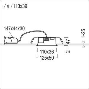 Plafonnier encatré à LED, compact, linéaire (luminaire complet) pour éclairage d'accentuation flexible et éclairage horizontal de surfaces horizontales avec une brillance élevée et un excellent défilement ; avec 3 têtes d'éclairage miniature individuelles en disposition linéaire ; distribution lumineuse précise et uniforme ; excellent défilement UGR<13, angle de défilement 45° ; lampe : 11W LED1000-927 ; Distribution lumineuse FLOOD ; réflecteur argenté avec bord décoratif noir, grand brillant ; Rendu des couleurs Ra > 90, température de couleur 2700 K (blanc chaud) ; Tolérance de la couleur (MacAdam intial): 2 ; Flux lumineux du luminaire: 950 lm, Efficacité lumineuse du luminaire: 68 lm/W ; durée de vie : après 50000h 90% du flux lumineux initial ; modèle complet comprenant le luminaire et l'unité à ballasts séparée, Luminaire pilotable via DALI (via DALI uniquement) ; refroidissement passif par gestion thermique innovante ; corps en fonderie d'aluminium, noir laqué ; unité réflecteur en Polycarbonate (PC) à deux éléments : tête aluminisé, à facettes grand brillant / pied carré avec bord décoratif ; luminaire câblé sans halogène ; raccordement plug & play entre l'unité luminaire et le ballast ; Puissance du luminaire: 14 W ;raccordement : Bornier à 4 pôles ; pas de possibilité de câblage en dérivation ; tension secteur : 220-240V/ 50/60Hz ; montage avec clips de fixation pour plafonds de 1-25 mm d'épaisseur ; découpe du plafond : 39x113mm, profondeur d'encastrement : 100mm + épaisseur du plafond ; poids : 0,4 kg ;Note : possibilité de commander en option via mySUPERSYSTEM INTEGRAL différentes combinaisons de couleur (personnalisation du design) des différents éléments