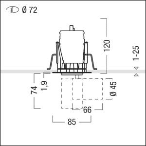 Unité d'éclairage encastrée pour l'encastrement sans bord à ras du plafond ; avec 1 tête de projecteur à LED, taille midi ; avec un système de lentilles pour un éclairage d'accentuation de qualité dans les musées et les salles d'exposition ; les combinaisons de platines à LED, lentille et film produisent des répartitions lumineuses d'une intensité élevée ainsi qu'une transition douce, sans lumière diffuse du cône d'éclairement ; lampe : 1 7,2 W, Rendu des couleurs Ra > 90, température de couleur 3000 K ; Luminaire / projecteur à distribution extensive flood ; tolérance chromatique : SDCM 2 initial, platines à LED de premier choix ; Flux lumineux du luminaire: 650 lm, Efficacité lumineuse du luminaire: 90 lm/W ; durée de vie : 50000 h avec 90 % de flux lumineux ; tête de projecteur orientable sur 350° dans le plan horizontal et sur 90° dans le plan vertical, rétractable ; tête de projecteur en fonderie d'aluminium laqué blanc, encastrement à ras de plafond en plâtre (sans bord) laqué. Optique comprenant une lentille en verre et un film en Film plastique ; la bague avant sert au défilement et à la réception de films ; boîtier d'encastrement en fonderie d'aluminium; montage par fixation vissée masquée, pour des épaisseurs de plafond de 1 à 25 mm ; découpe du plafond : Ø 72 mm, profondeur d'encastrement : 120 mm ; poids : 0,24 kgNote : appareillage (600 mA) ; câble d'alimentation et boîtier de distribution à commander séparément. Film interchangeable pour obtenir d'autres répartitions lumineuses ; le réflecteur annulaire ou le tube de défilement prolongé peuvent remplacer la bague avant.;N'est pas recommandé pour une utilisation avec des détecteurs de présence et de mouvements.