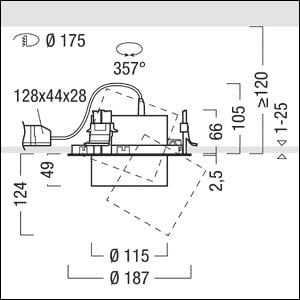 Projecteur à LED encastré multifonction avec température de couleur stabilisée ; optimisé pour un éclairage de mise en valeur efficace et puissant dans les applications de vente au détail / automobiles et l’éclairage architectural ; Rendu des couleurs Ra > 80, température de couleur 3000 K (blanc chaud) ; Luminaire à répartition très extensive very wideFlood 52 °; Tolérance de la couleur (MacAdam intial): 2 ; Flux lumineux du luminaire: 4200 lm, Efficacité lumineuse du luminaire: 124 lm/W ; durée de vie : 50000 h jusqu'à une diminution du flux lumineux à 90 % ; Puissance du luminaire: 34 W ; modèle complet comprenant un projecteur et un convertisseur Luminaire commutable on/off pour un montage au plénum ; raccordement électrique : Bornier bipolaire ; tension secteur : 220-240V/ 50/60Hz ; tête d'éclairage multifonction orientable sur le plan horizontal à 357° et rétractable (-20°/+45°) ; boîtier de projecteur en fonderie d'aluminium, surface : noir Peinture microstructurée ; excellent contrôle de l'éblouissement grâce à la bague avant en Polycarbonate (PC) noir ; la bague avant sert à l’installation d’un accessoire (optique, protection, paralume nid d’abeilles) ; miroir réflecteur en Polycarbonate (PC) aluminisé, haut brillant, sans irisation ; miroir réflecteur servant de réflecteur de rechange et pouvant être adapté ; collerette d’encastrement en Polycarbonate (PC) ; montage : collerette d’encastrement avec clips de fixation anti-dérapants pour l'encastrement sans outil dans les plafonds d'une épaisseur de 1 à 25 mm ; découpe au plafond : Ø 175 mm, profondeur d'encastrement : 120 mm ; poids : 0,84 kg