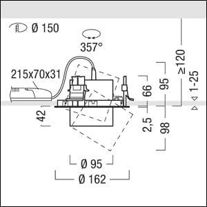 Projecteur à LED encastré multifonction avec température de couleur stabilisée ; optimisé pour un éclairage de mise en valeur efficace et puissant dans les applications de vente au détail / automobiles et l’éclairage architectural ; Rendu des couleurs Ra > 90, température de couleur (ajustable) 2500-6500 K (blanc chaud) ; Luminaire / projecteur à distribution extensive flood 26 °; Tolérance de la couleur (MacAdam intial): 3 ; Flux lumineux du luminaire: 2500 lm, Efficacité lumineuse du luminaire: 71 lm/W ; durée de vie : 50000 h jusqu'à une diminution du flux lumineux à 90 % ; Puissance du luminaire: 35 W ; modèle complet comprenant un projecteur et un convertisseur Luminaire pilotable via DALI (via DALI uniquement) pour un montage au plénum ; raccordement électrique : Bornier bipolaire ; tension secteur : 220-240V/ 50/60Hz ; tête d'éclairage multifonction orientable sur le plan horizontal à 357° et rétractable (-20°/+45°) ; boîtier de projecteur en fonderie d'aluminium, surface : noir Peinture microstructurée ; excellent contrôle de l'éblouissement grâce à la bague avant en Polycarbonate (PC) noir ; la bague avant sert à l’installation d’un accessoire (optique, protection, paralume nid d’abeilles) ; miroir réflecteur en Polycarbonate (PC) aluminisé, haut brillant, sans irisation ; miroir réflecteur servant de réflecteur de rechange et pouvant être adapté ; collerette d’encastrement en Polycarbonate (PC) ; montage : collerette d’encastrement avec clips de fixation anti-dérapants pour l'encastrement sans outil dans les plafonds d'une épaisseur de 1 à 25 mm ; découpe au plafond : Ø 150 mm, profondeur d'encastrement : 120 mm ; poids : 0,85 kg