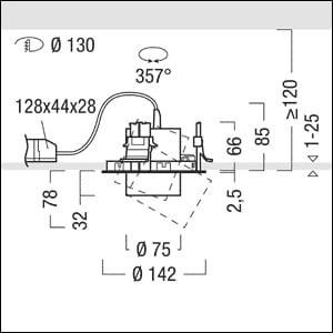 Projecteur à LED encastré multifonction avec température de couleur stabilisée ; optimisé pour un éclairage de mise en valeur efficace et puissant dans les applications de vente au détail / automobiles et l’éclairage architectural ; Rendu des couleurs Ra > 80, température de couleur 4000 K (blanc neutre) ; Luminaire / projecteur à distribution extensive flood 23 °; Tolérance de la couleur (MacAdam intial): 2 ; Flux lumineux du luminaire: 2100 lm, Efficacité lumineuse du luminaire: 105 lm/W ; durée de vie : 50000 h jusqu'à une diminution du flux lumineux à 80 % ; Puissance du luminaire: 20 W ; modèle complet comprenant un projecteur et un convertisseur Luminaire commutable on/off pour un montage au plénum ; raccordement électrique : ; tension secteur : 220-240V/ 50/60Hz ; tête d'éclairage multifonction orientable sur le plan horizontal à 357° et rétractable (-20°/+45°) ; boîtier de projecteur en fonderie d'aluminium, surface : blanc Peinture microstructurée ; excellent contrôle de l'éblouissement grâce à la bague avant en Polycarbonate (PC) blanc ; la bague avant sert à l’installation d’un accessoire (optique, protection, paralume nid d’abeilles) ; miroir réflecteur en Polycarbonate (PC) aluminisé, haut brillant, sans irisation ; miroir réflecteur servant de réflecteur de rechange et pouvant être adapté ; collerette d’encastrement en Polycarbonate (PC) ; montage : collerette d’encastrement avec clips de fixation anti-dérapants pour l'encastrement sans outil dans les plafonds d'une épaisseur de 1 à 25 mm ; découpe au plafond : Ø 130 mm, profondeur d'encastrement : 120 mm ; poids : 0,44 kg