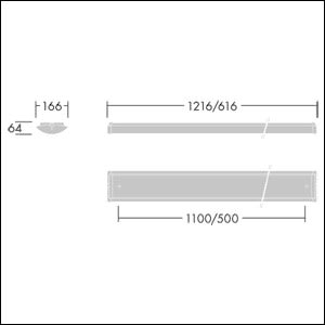 Luminaire LED Monté en plafonnier de faible profondeur. Électronique, Appareillage gradable DALI. Classe électrique I, IP44. Corps : acier pré-peint. Embouts : Matière plastique blanc. Diffuseur : acrylique dépoli. Positions de fixation en trou de serrure de Ø 14 mm pour une fixation directe au plafond, au mur ou aux supports. Intervalles de fixation : 1100 mm. Deux entrées de câble Ø 19 mm à l’arrière du corps et opercules dans les embouts. Passe-fil inclus. Connexion électrique via bornier à poussoir 2 x 2,5 mm² 5 P. Câblage traversant. Livré avec LED 3 000 KDimensions : 1216 x 166 x 64 mmPuissance du luminaire: 53,5 WFlux lumineux du luminaire: 5700 lmEfficacité lumineuse du luminaire: 107 lm/WPoids : 2,81 kg