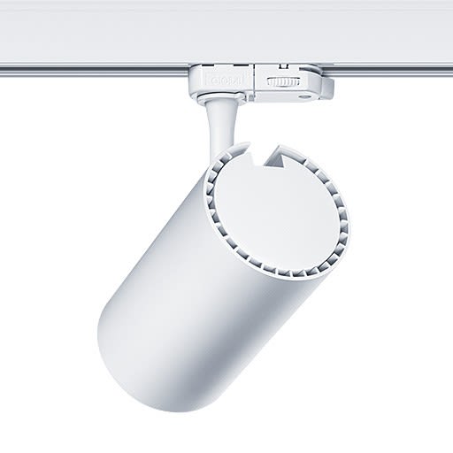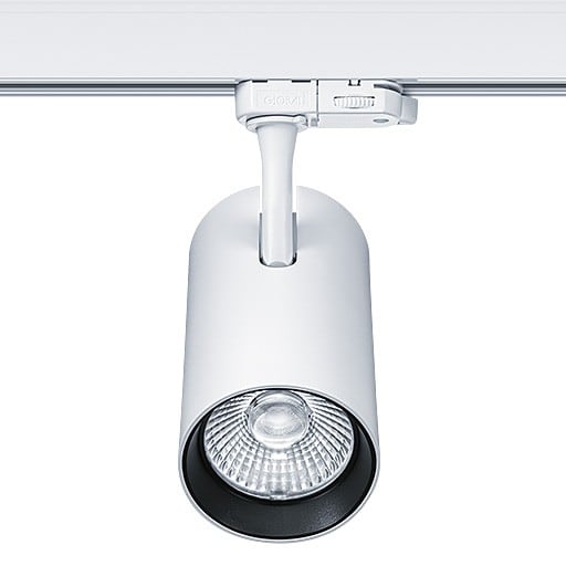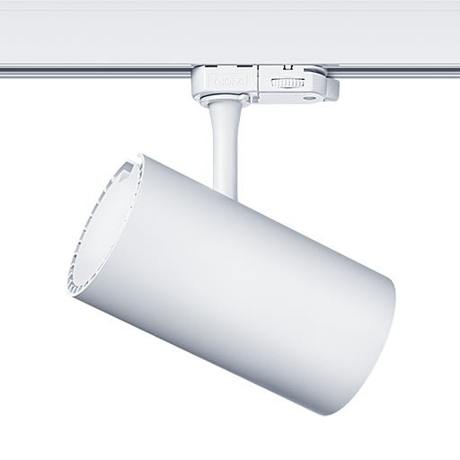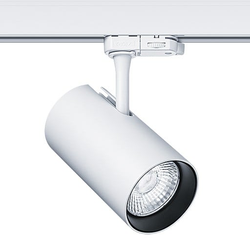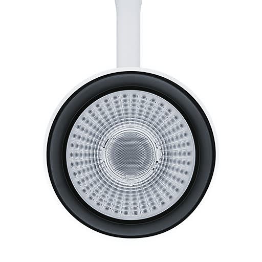 Projecteur à LED pour un éclairage de mise en valeur bien défini. Angle de rayonnement 38° pour les applications de vente au détail et les expositions. Flux lumineux global: 3200 lm, Puissance du luminaire: 34 W. Efficacité lumineuse du luminaire: 94 lm/W. Durée de vie : 50 000 h@ L70. Rendu des couleurs Ra > 90, température de couleur 4000 K, Tolérance de la couleur (MacAdam intial): 3. Adaptateur de rail triphasé universel. Projecteur orientable sur le plan horizontal de 350° et inclinable sur le plan vertical de 90°. Boîtier avec convertisseur intégré en fonderie d'aluminium, de couleur blanc (RAL 9016). Dimensions : 146 x 79 x 179 mm, poids : 0,7 kg.