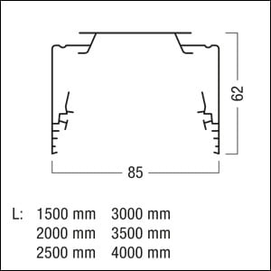 Rail porteur en aluminium extrudé, recouvert de peinture à la résine de polyester blanc. Länge: 2500 mm. Non précâblé en atelier, jonctions mécaniques fournies. En cas d'utilisation du rail dans des environnements à forte sollicitation chimique, veuillez consulter votre conseiller. Dimensions : 2500 x 85 x 62 mm poids : 3,89 kg