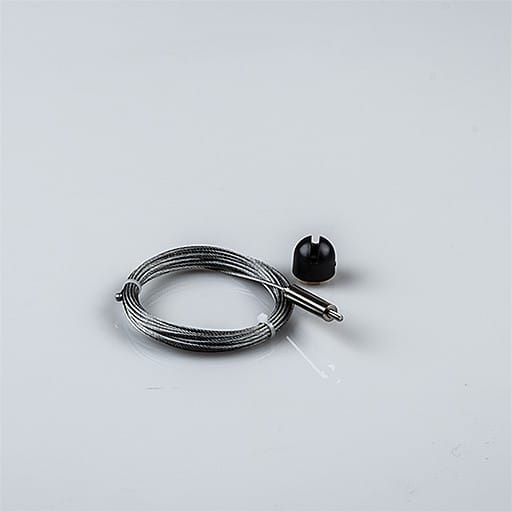 Suspension à câble d´acier (Set) comprenant : un dôme de suspension noir ; un câble d'acier diamètre de 1,8 mm, longueur de 5000 ; un système de suspension breveté pour le réglage en continu de la hauteur, une fixation pour le système de suspension breveté soit au niveau du plafond, soit au niveau du rail conducteur ; charge maximale : 20 kg