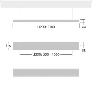Luminaire suspendu de faible épaisseur avec distribution asymétrique. Driver gradable DALI. Corps : tôle d'acier, thermopoudré blanc (similaire à RAL9016). Embouts : tôle d'acier thermopoudré blanc (similaire à RAL9016). Grille : aluminium brillant, double parabole. Classe électrique I, IP20, Résistance aux impacts : IK03. Connexion électrique via cordon d'alimentation pré-installé (2.5m). Livré avec LED 3 000 K. Kit de suspension à commander séparément..Connecteur de suspension en Y inclus – cordon de suspension avec rosace de plafond à commander séparément (22171581).Dimensions : 1180 x 116 x 44 mmPuissance du luminaire: 16 WFlux lumineux du luminaire: 2050 lmEfficacité lumineuse du luminaire: 128 lm/WPoids : 3,5 kg