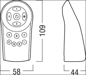 Télécommande à infrarouge pour la commande de luminaires et groupes de luminaires (allumage/extinction, gradation). Possibilité de programmer 3 ambiances lumineuses et d'activer et graduer jusqu'à 5 zones séparément. La télécommande à infrarouge dispose d'une touche allumage/extinction, de 3 touches d'ambiances et de 5 touches pour la sélection des zones. Portée jusqu'à 10 m, protocole IR : RSTEP, 38KHz ; corps en matière plastique (ABS), 2 batteries AAA de 1,5 V, Température ambiante : 5°C à +40°C admissibleDegré de protection : IP20Dimensions : 58 x 109 x 44 mmPoids : 0,1 kg