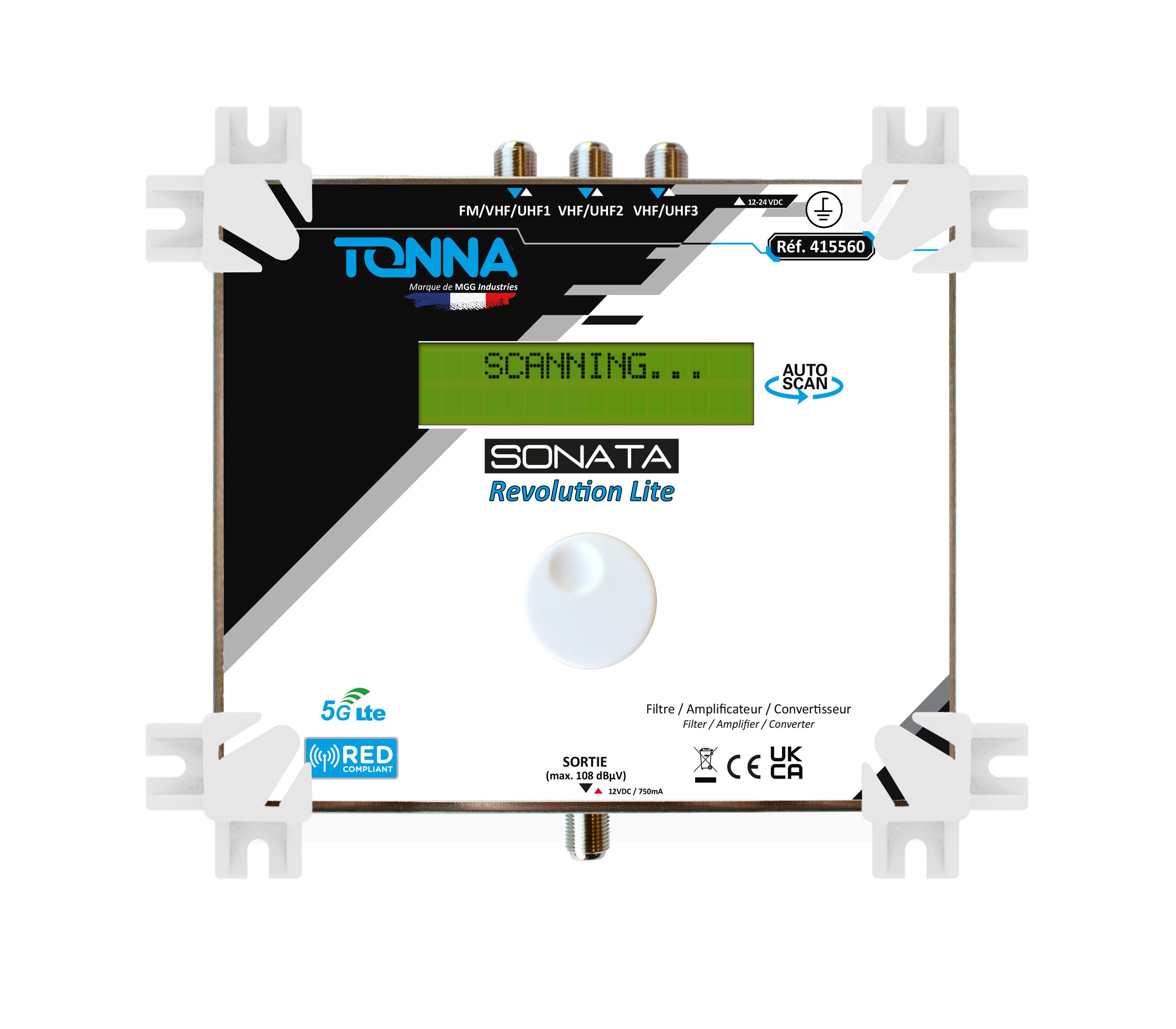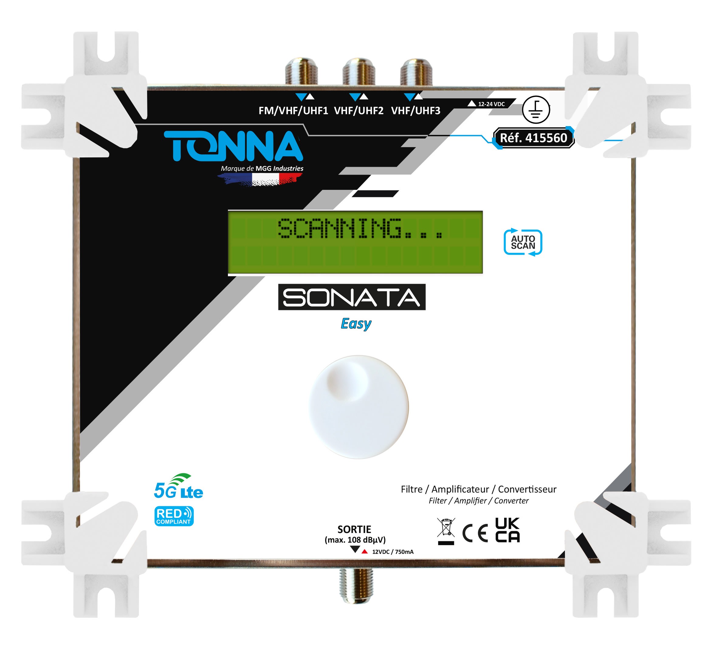 Centrale sonata EASY amplificateur TNT / filtrage 4G - 5G - UHF/FM/VHF-RNT-DAB+/ 1 Sortie - traitement 32 filtres/50 canaux - gain 65 dBµv - niveau de sortie 114dBµv - contrôle automatique du gain - Alilentation déportée par câble coaxial.