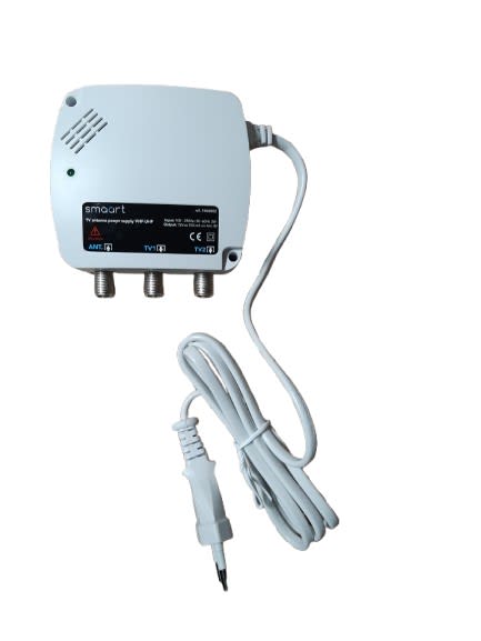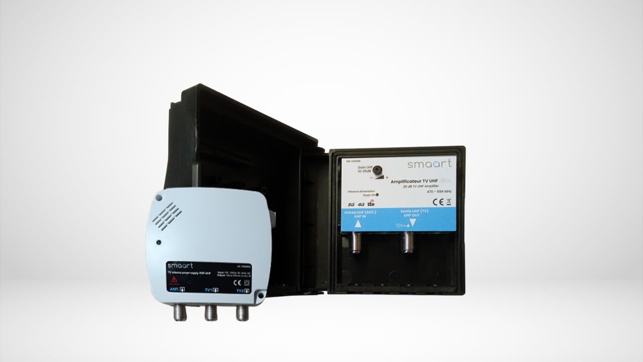 Kit amplificateur uhf 25db - 4g/5g -lte700- 1e/1s - alim. fournie ref.301055 de 12vcc 50ma - 2 sorties tv 'f' - multi-tensions possible 5 à 24vcc - gain réglable - blindage 100% - fixation : murale ou au mât par colliers de serrage fournis