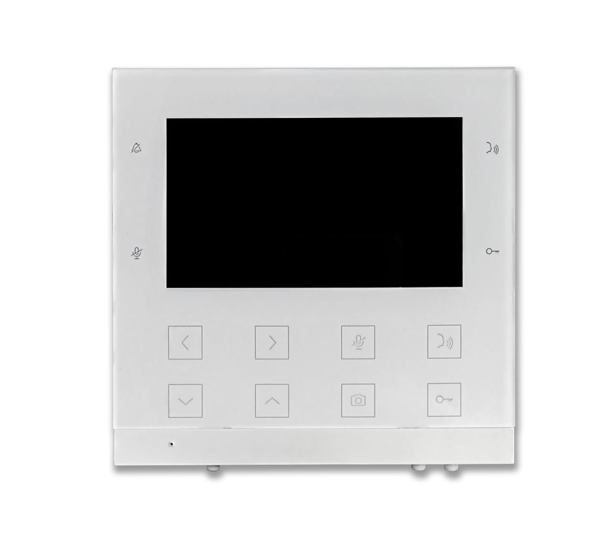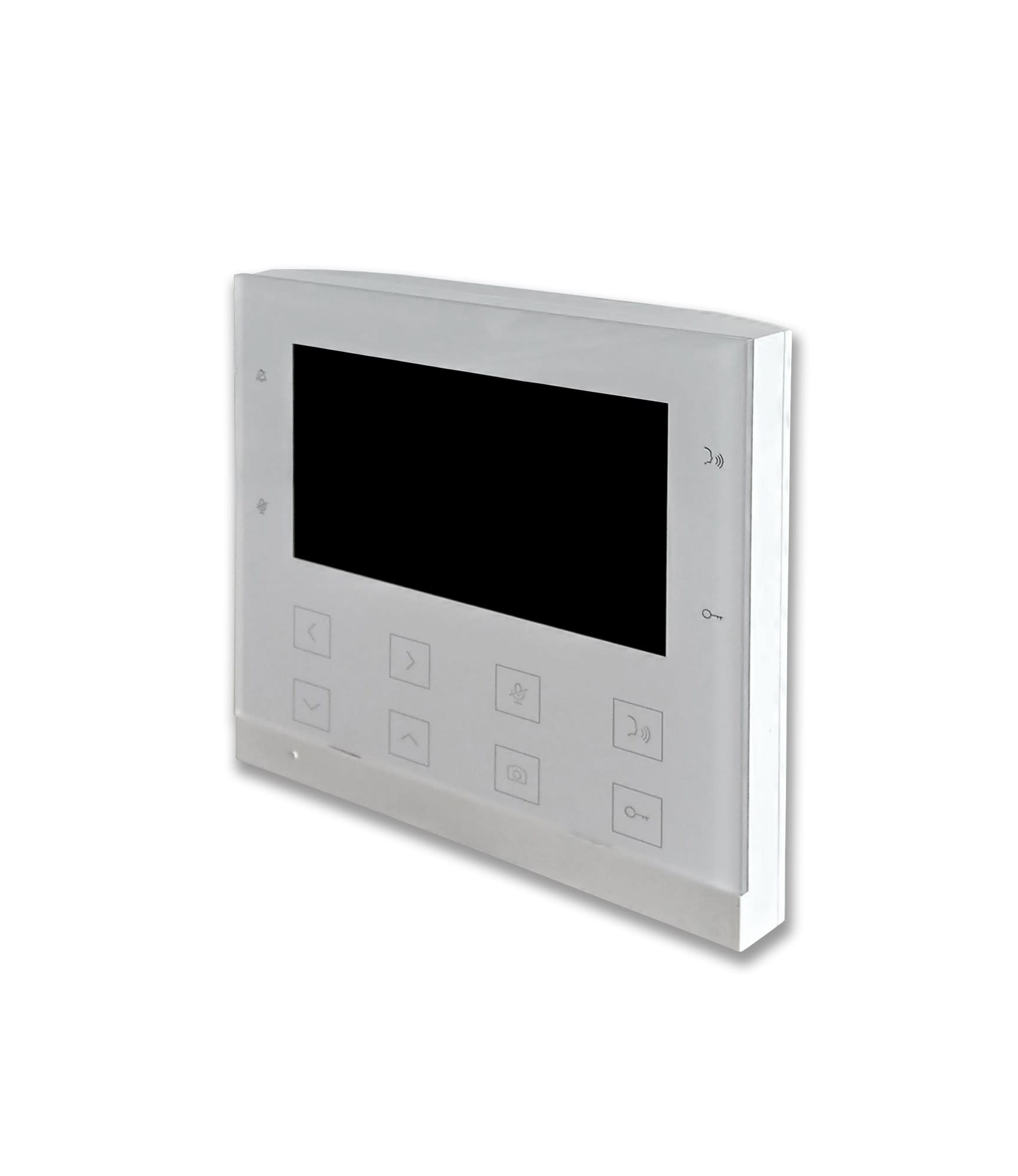 Moniteur main libre Prisme en technologie bus 4 fils - écran lcd au format 16/9ème : 4,3 pouces - touches d'utilisations rapide en braille - système boucle T intégré - coupure et réglage du volume sonnerie - dimension : 135 x 131 x 27 mm
