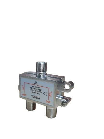 Répartiteur coaxial 2 directions ulb_5/2400 mhz _ 2 voies symétriques - perte de répartition tv/sat 4,7/6,5 db - connecteur type f femelle - passage alimentation 24 V= / 1A maximum - protection par diode sur chaque sortie - emballage carton