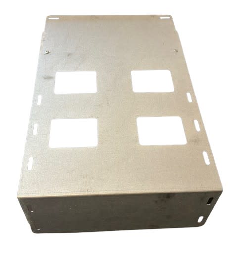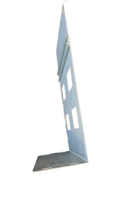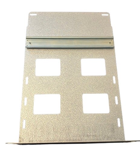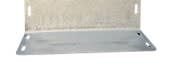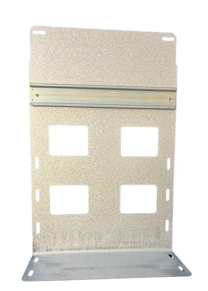 Support de box universel métallique gris, format en L, avec rail din pour intégrer le point d'alimentation supplémentaire. Fente pour passage de collier ou attache universelle
