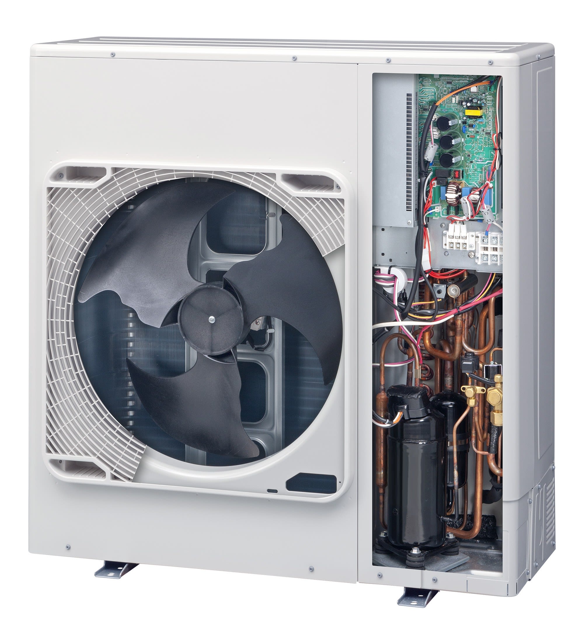 Unité Extérieure Estia 8kW ; R32 ; Liaisons frigorifiques ; Compacte : mono-ventilateur ; Départ d'eau 35°C : SCOP = 4,63, ηs = 182%, A+++ ; Départ d'eau 55°C : SCOP = 3,63, ηs = 142%, A++ ; Fonctionnement jusqu'à -25°C; 41dB(A) à 5m;