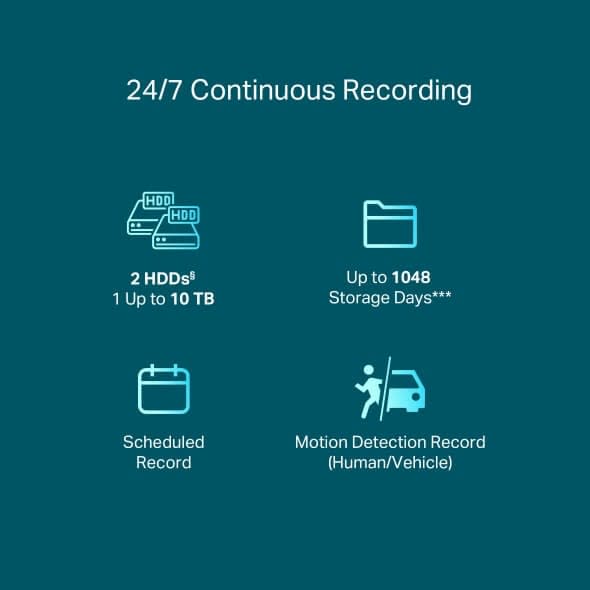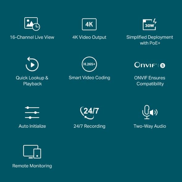 Enregistreur vidéo IP PoE+ 140W VIGI 16 canauxSortie vidéo HDMI 4K et capacité de décodage 16MP16 ports PoE+ dédiés pour un déploiement simplifié de caméra IPLecture simultanée sur 16 canauxEnregistrement continu 24h/24 et 7j/7