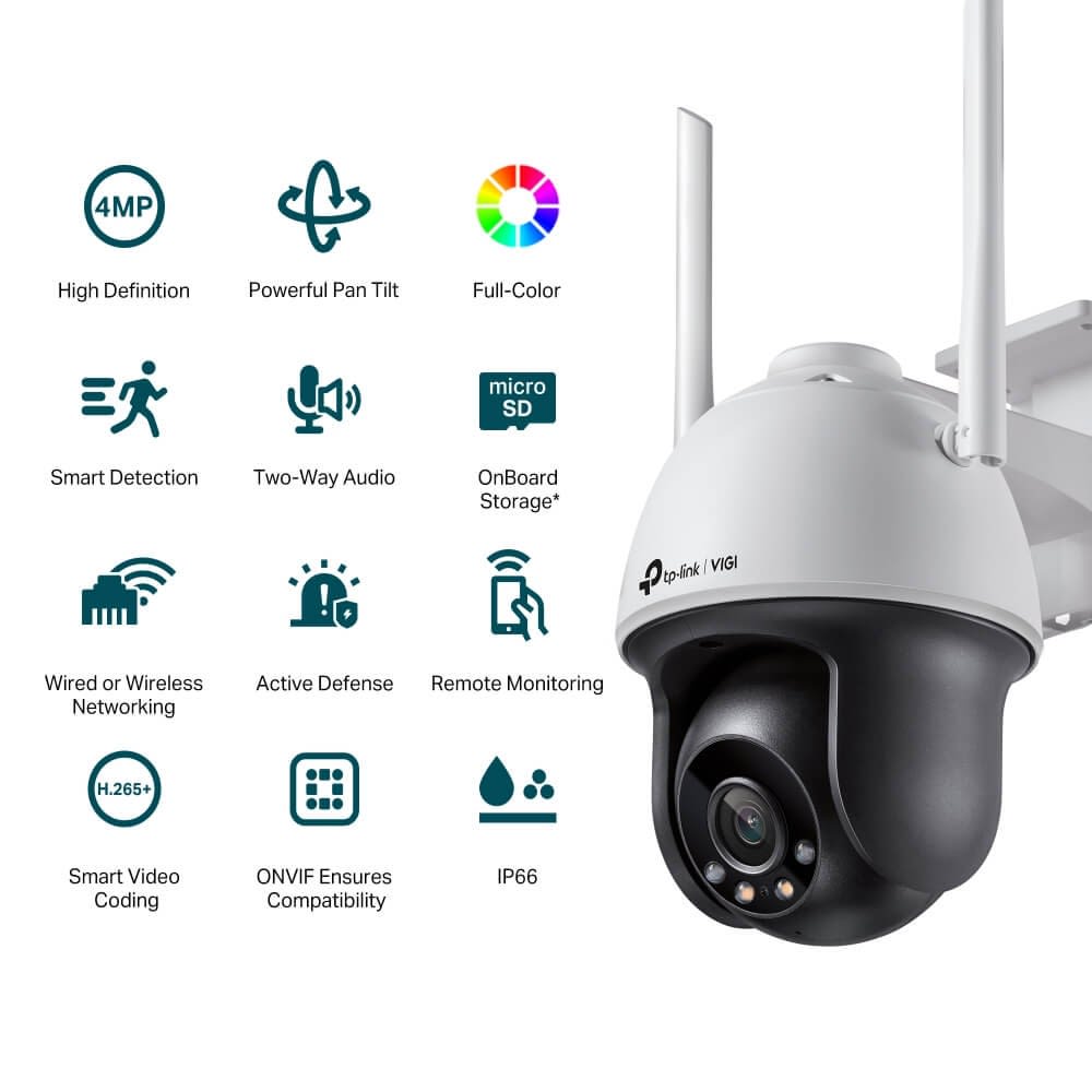 Caméra réseau Pan Tilt VIGI 4MP Outdoor Full-Color - Connexion Wi-Fi extérieure , câblage simple - Clarté et couleurs, tout en un - Détection intelligente - Défense Active - Chaque événement est sous votre contrôle.