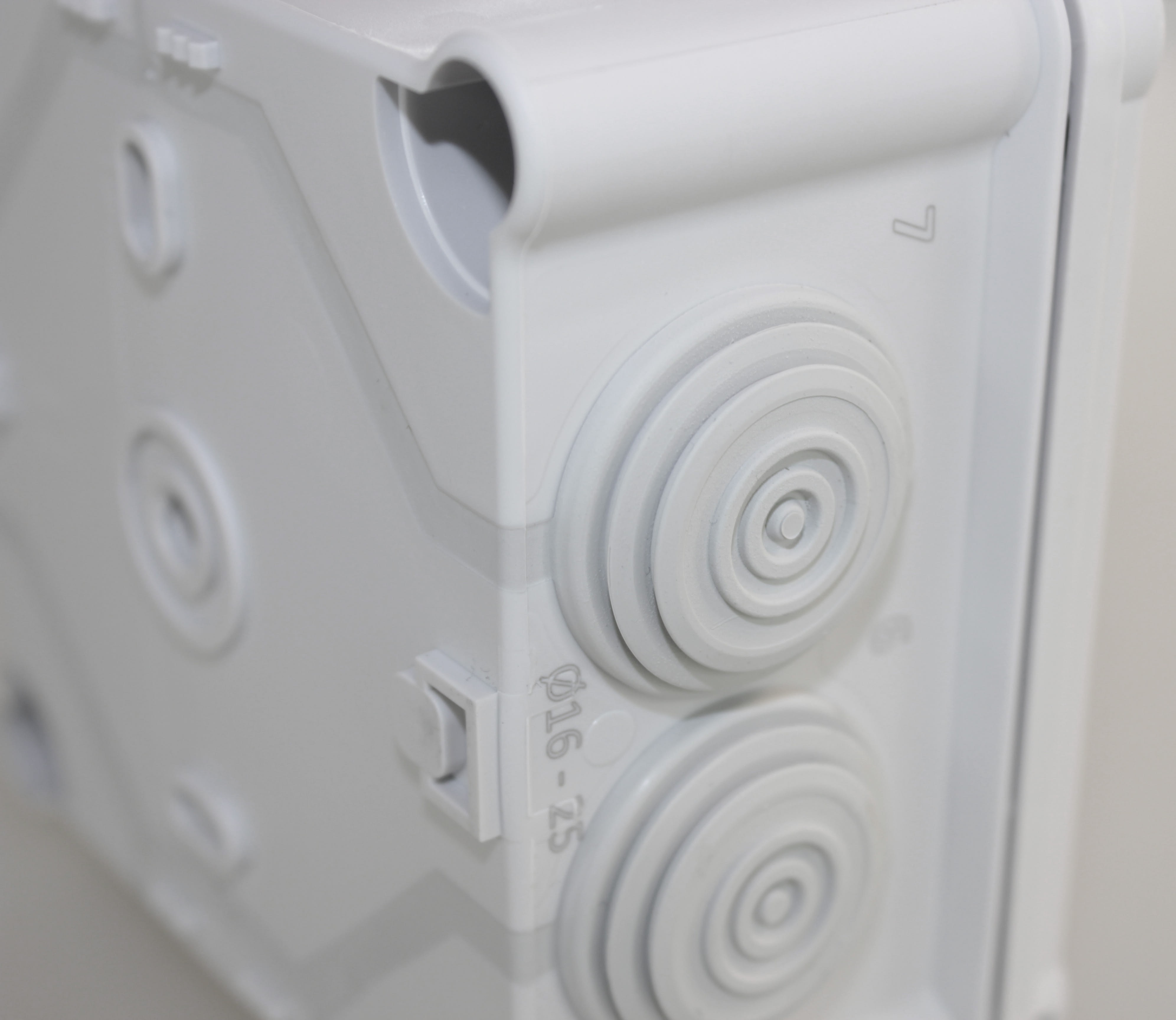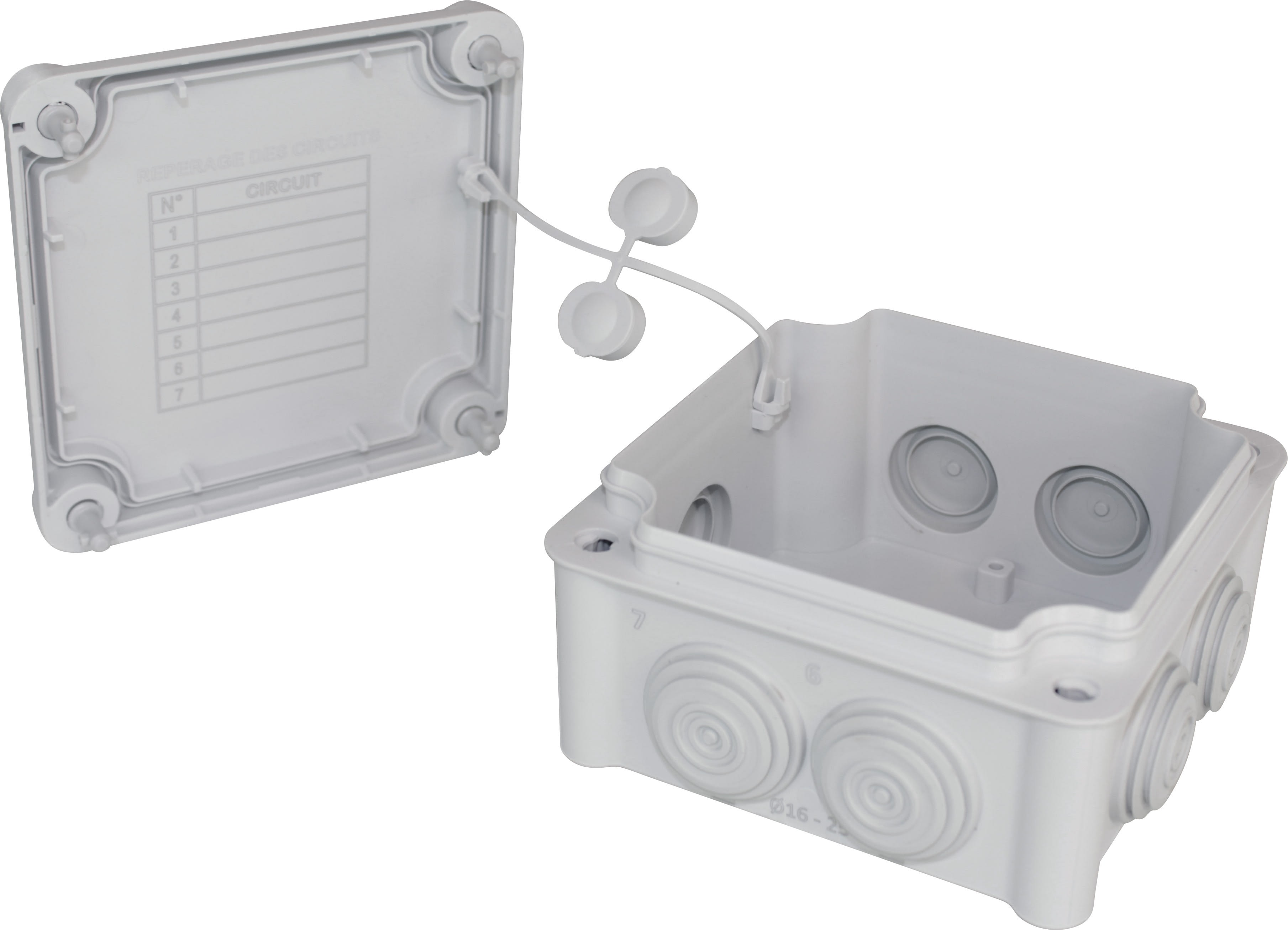 Design et ergonomie : - Bouchons fournis pour une isloation optimale- Zone de marquage sur le couvercle et à l'extérieur/ extérieur de la boîte pour un meilleure repérage des circuits - Tétines à gradin bi-injectées, perçables sans outils si Ø<16mm, étanchéité sur tube IRL. - Couvercle relié à la boîte avec lien - Fixation central pour fixation par vis- MADE IN FRANCE