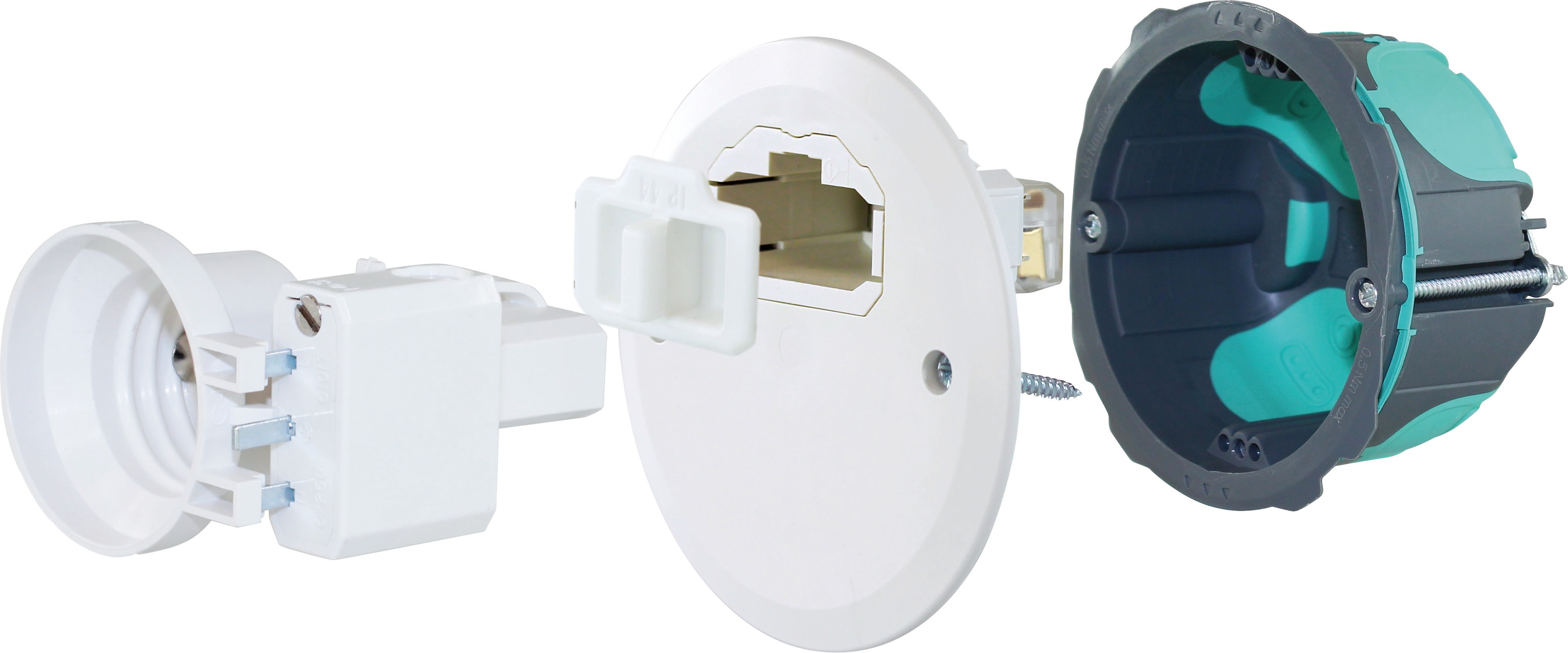 Collerette large : - Fine et profilée, pour un placage parfait au mur et garantie l'étanchéité autour de la boîte.Rigidité élevée : - +15% par rapport à la moyenne des boîtes du marché Nombreuses entrées :- Entrée spécifique pour utilisation avec câble R02V 3G2.5 ou VVF 3G1.5 sans gaine. Lèvre d'étanchéité :- Sur tout le pourtour de la boîte. Renforce l'étanchéité (Garantie étanche à 99%)DCL de haute qualité : - Puit DCL avec connexions transparentes, capot de protection IP44- Couvercle DCL légèrement biseauté, parfaitement plaqué sur la boîte, avec logement pour micromodule intégré. - Fiche DCL - douille pour raccordement d'une ampoule E27.